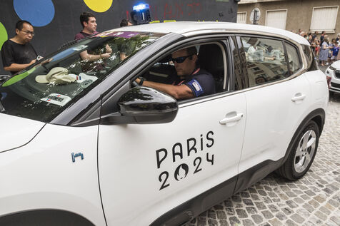 France, Paris, 2024-07-15. Monday, July 15, 2024, the Olympic flame passes through rue Alphand in the 13th arrondissement of Paris. Photograph by Pascal SONNET / Hans Lucas.