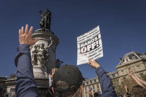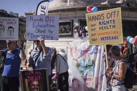 France, Paris, 2025-04-05. Faced with Trump and his contempt for international law, hundreds of thousands of Americans are taking to the streets in the United States of America. In support of this action, Americans in France are demonstrating at Place de la République in Paris, under the slogan “Hands Off”. Photograph by Pascal SONNET / Hans Lucas.