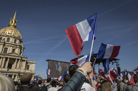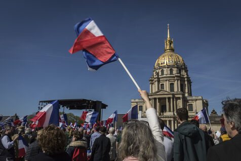 France, Paris, 2025-04-06. Les partisans du Rassemblement National se sont réunis ce dimanche 6 avril 202, pour soutenir Marine Le Pen après sa condamnation pour détournement de fonds publics. Photographie de Pascal SONNET / Hans Lucas.