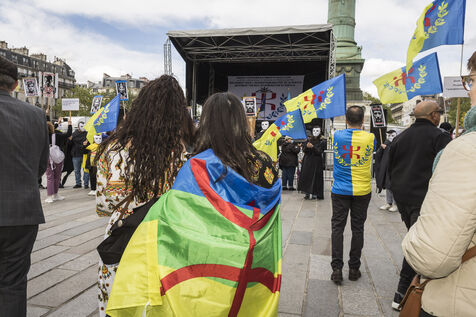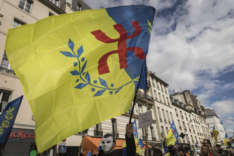 France, Paris, 2025-04-20. Following an appeal by the Kabyle Government in Exile (Anavad) to all its supporters, a peaceful march in favor of Kabylian independence brought together hundreds of demonstrators between Place de la Nation and Place de Bastille. Photograph by Pascal SONNET / Hans Lucas.