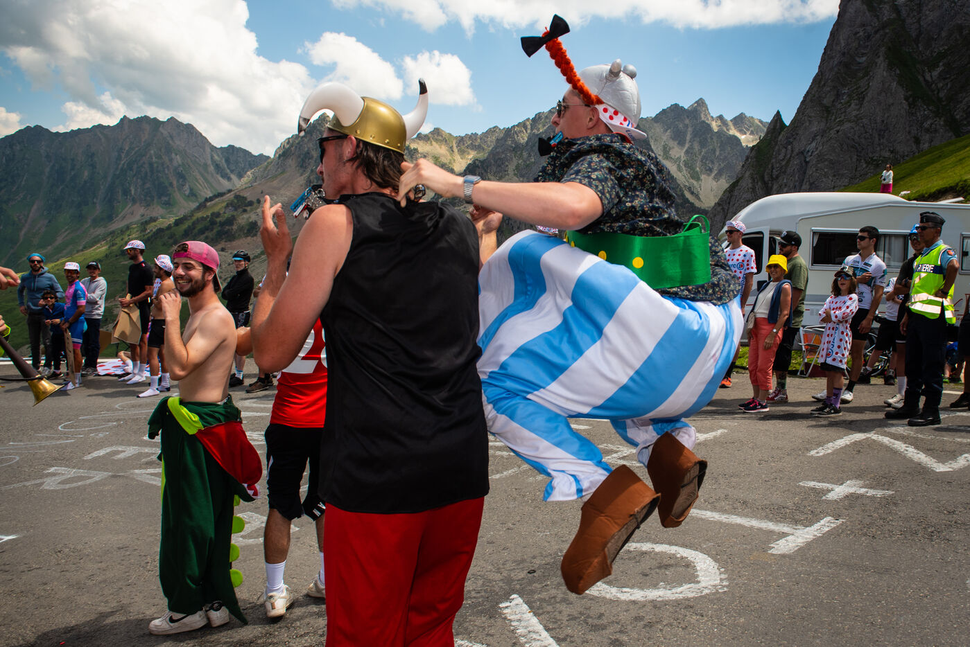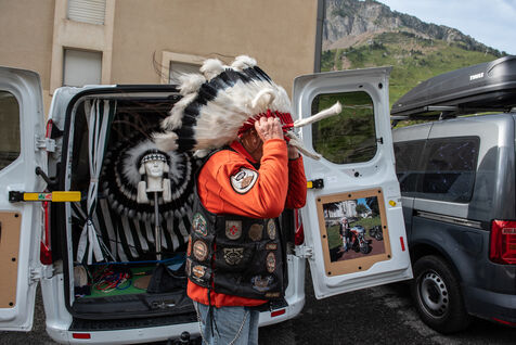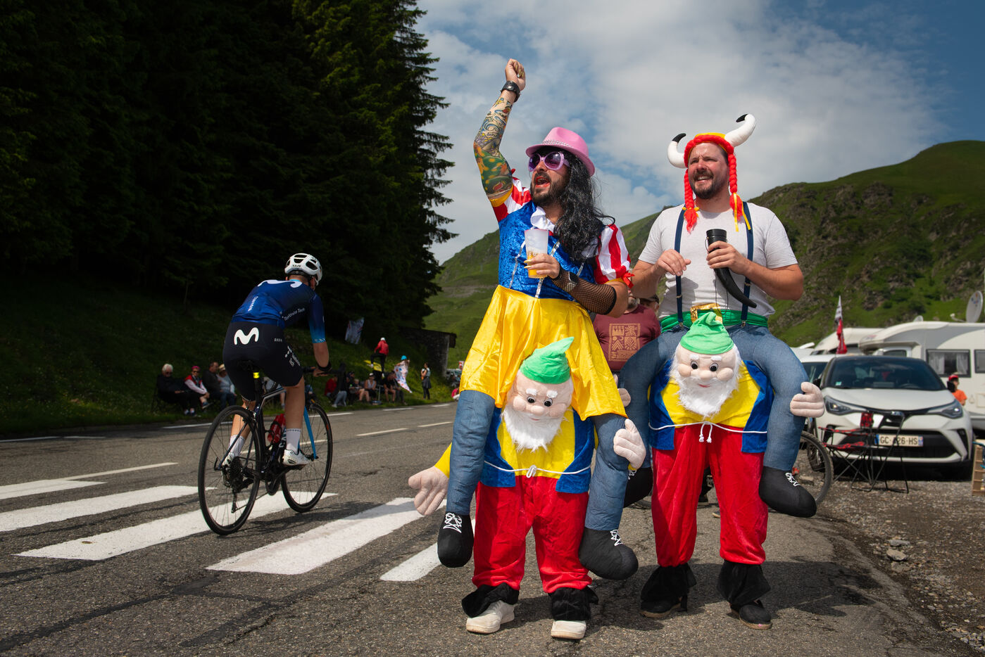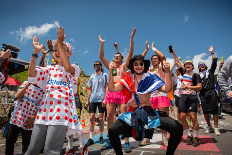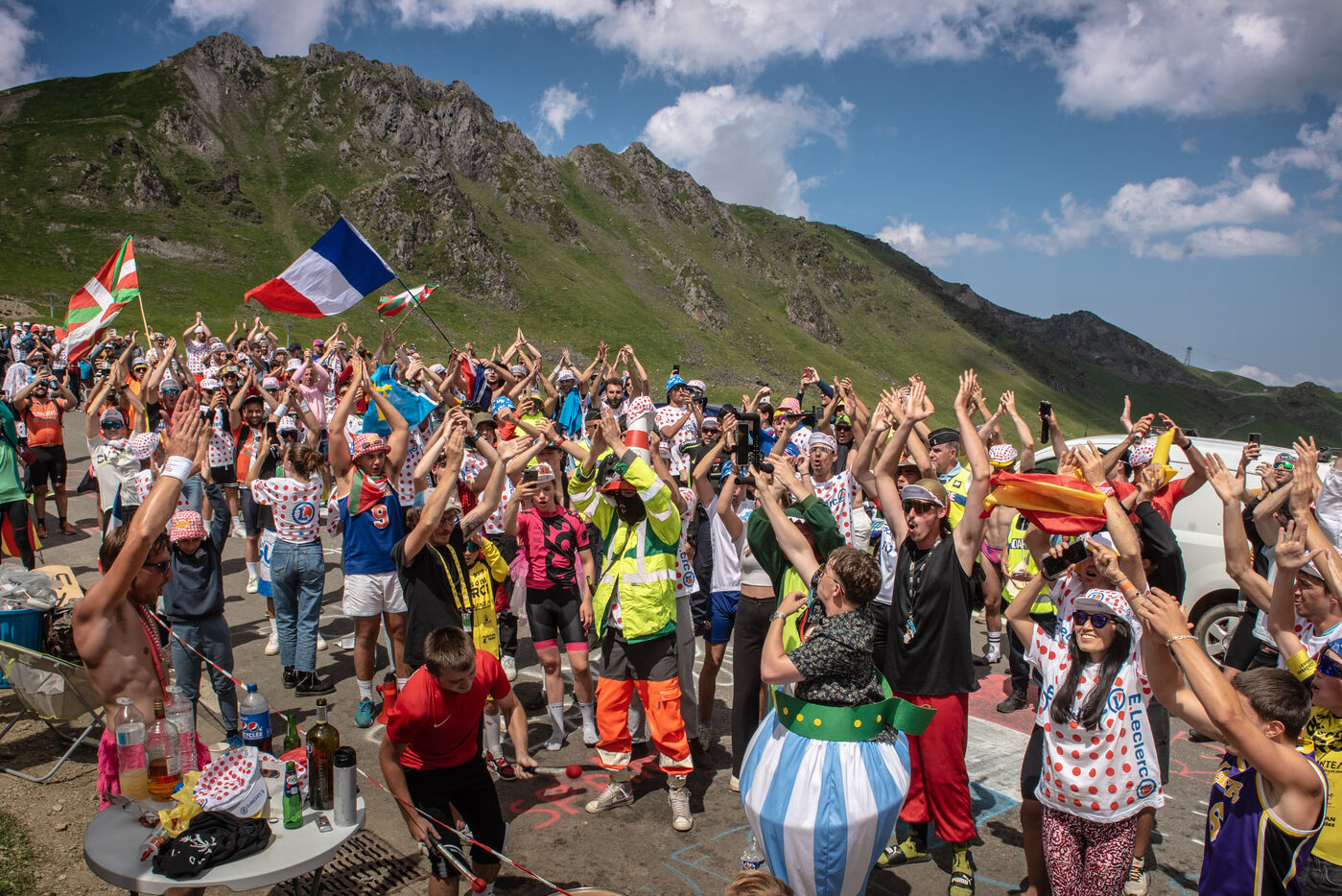 On 6 July 2023, many spectators are waiting for the cyclists and the advertising caravan on the Col du Tourmalet in the Pyrenees for the sixth stage of the Tour de France. Some of them have been on site for several days to secure the best position to watch this legendary mountain stage live. Tents and motor homes transform the pass. Here, cycling fans mix with party goers and eccentrics who hoping to grab the media's attention. For a day where everything seems allowed, young and old of different nationalities cohabit to take part in the show.