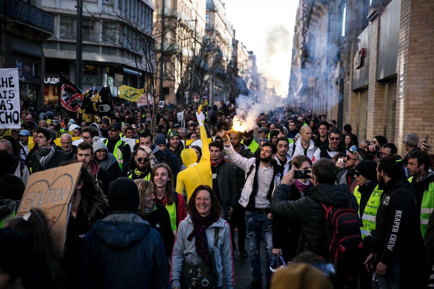 Manifestations des gilets jaunes le 16 fevrier 2019 dans le cadre de l'acte XIV de leur mouvement. A Toulouse, une manifestation réunissant plusieurs milliers de personnes s'élance pacifiquement dans les rues de la ville jusqu'à ce que des échauffourées éclatent dans le centre ville.