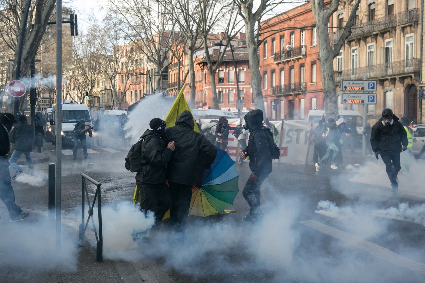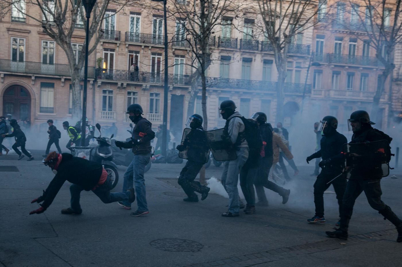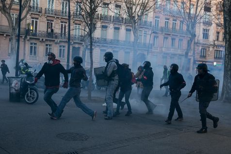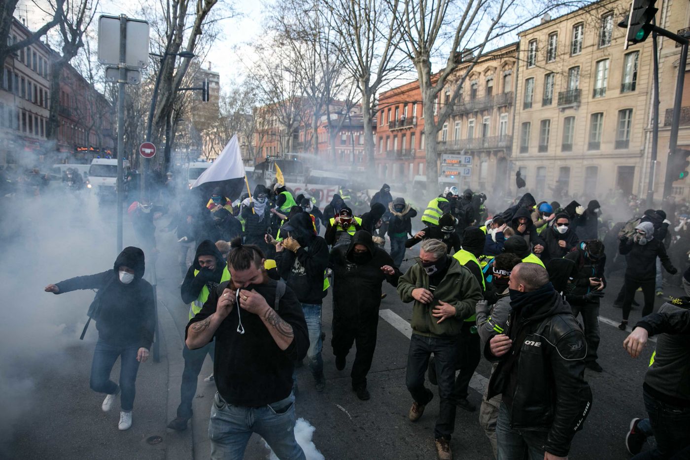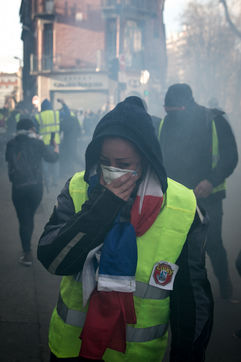 Manifestations des gilets jaunes le 02 Mars 2019 dans le cadre de l'acte XVI de leur mouvement. A Toulouse, une manifestation réunissant plusieurs milliers de personnes s'élance pacifiquement dans les rues de la ville jusqu'à ce que des échauffourées éclatent dans le centre.