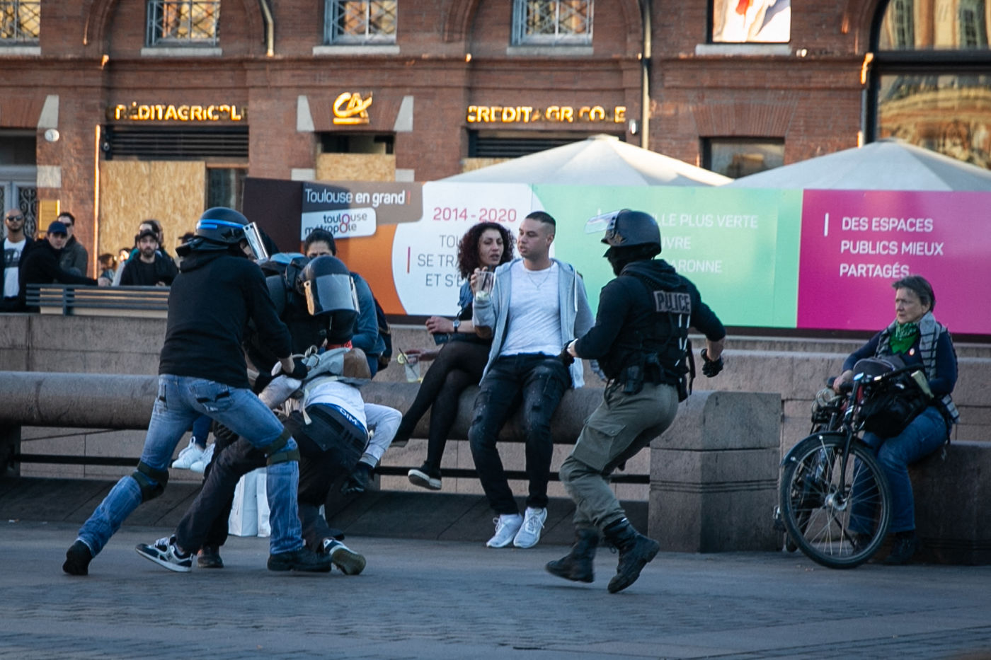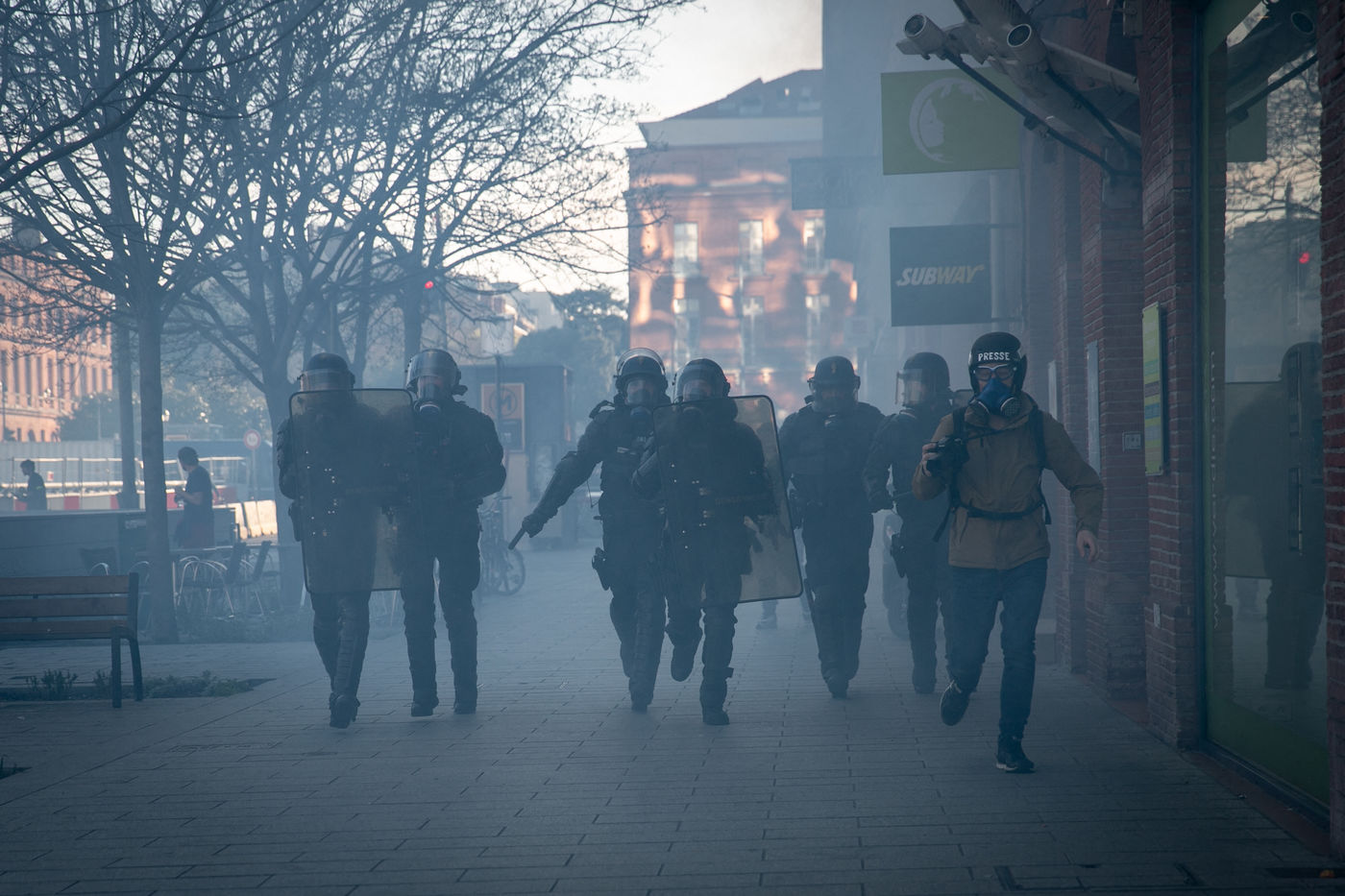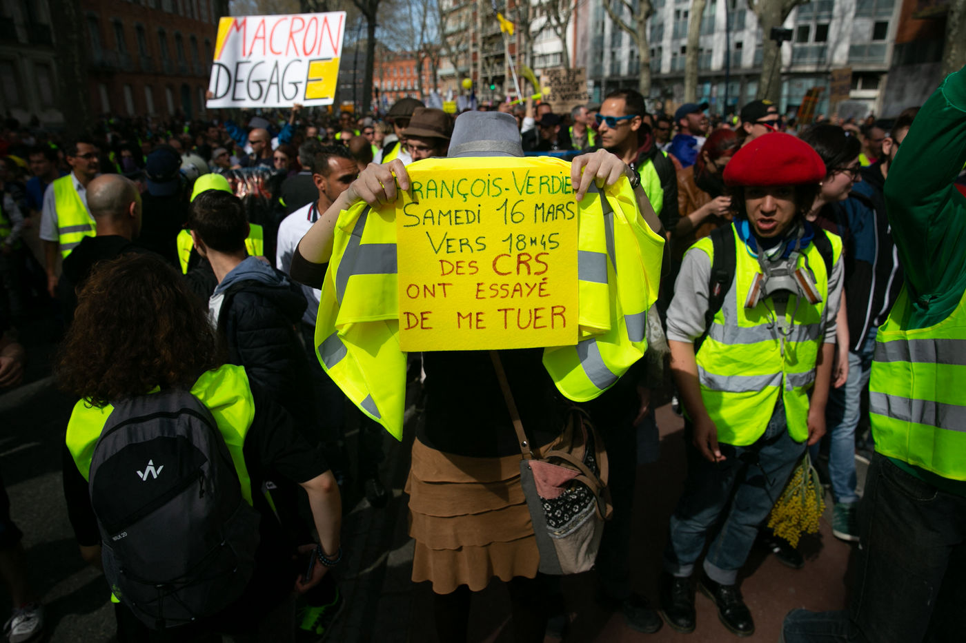 Manifestations des gilets jaunes le 23 Mars 2019 dans le cadre de l'acte XIX de leur mouvement. Pluseurs milliers de personnes ont manifesté à Toulouse. Certains manifestants ont réussi à atteindre la place du Capitole malgré une interdiction de manifester. Les forces de police chargent sans motif apparent dès le début de la manifestation, qui se poursuit ensuite dans le centre ville. Des heurts éclatent. Si le nombre de blessés est inconnus huit secouristes et trois journalistes ont été légerement blessés, les équipes de soins dénoncent le fait d'avoir été déliberement visées.