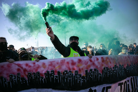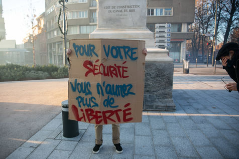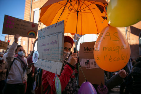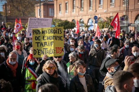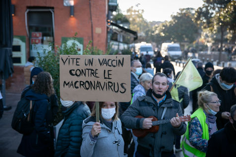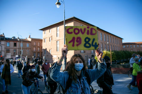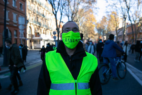En plein confinement, plusieurs milliers de personnes ont manifesté à Toulouse contre la politique sanitaire du gouvernement, la loi dite de "sécurité globale" et pour demander plus de moyens pour l'hôpital public, 21 novembre 2020.
