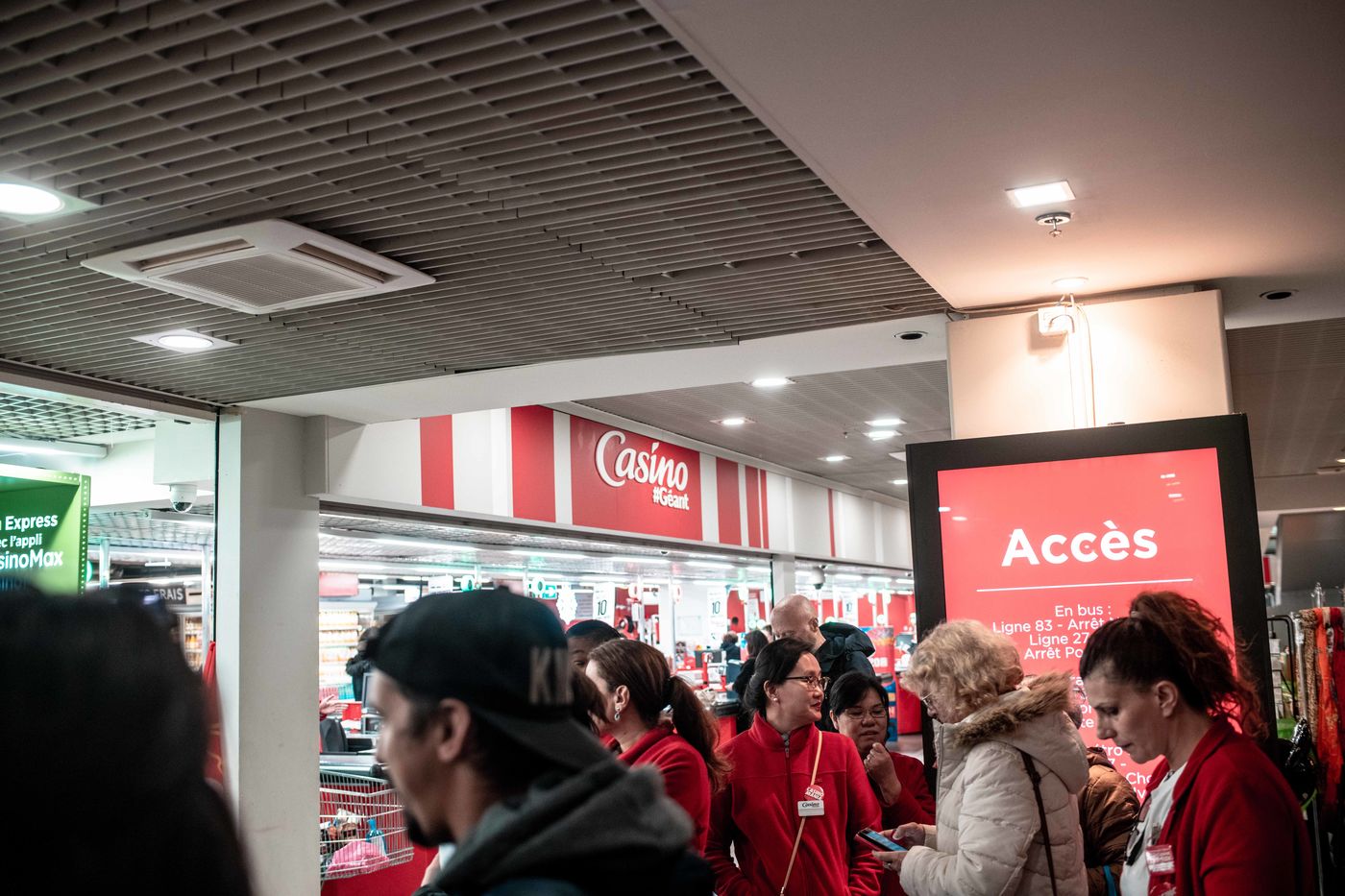 Les salaries du Groupe Casino occupent et manifestent au Casino de Porte d'Ivry contre les cessions d'activites. Le groupe Casino regroupe les magasins Casino, Franprix, Leader Price, Monoprix...
