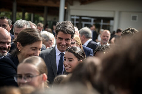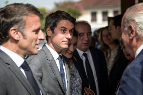 Il est accompagné du ministre de l?Éducation nationale, Gabriel Attal ; de la ministre des Sports, Amélie Oudéa-Castéra, et du maire de Pau, François Bayrou, secrétaire général du Conseil national de la refondation.