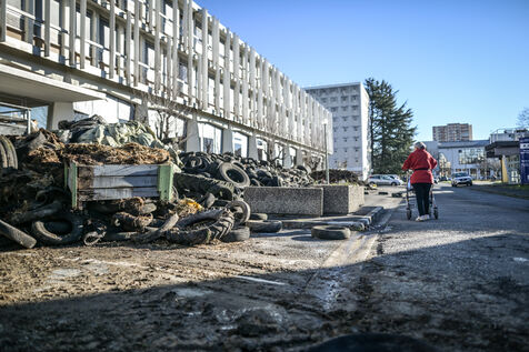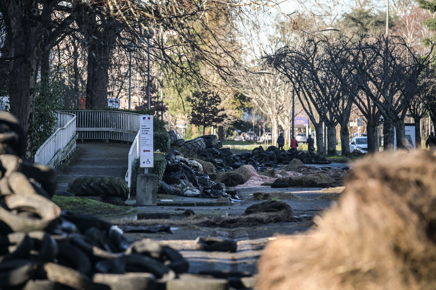 Dans la nuit de mercredi 24 à jeudi 25 janvier, environs 80 tracteurs ont manifesté et ont déversé des pneus, déchets végétaux et purin devant les locaux de la Direction départementale des Territoires et de la Mer. Cette action a été menée dans le cadre du mouvement national auquel prennent part nombre d'agriculteurs. Des passants observent les dégâts. Un nettoyage de grande ampleur sera nécessaire.