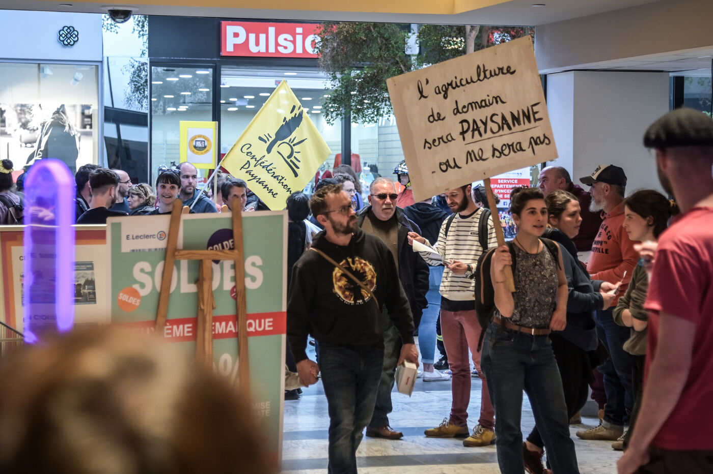 Ils ont ensuite investi le centre commercial Leclerc université pour y dénoncer les rémunérations insuffisantes des produits agricoles. Prise de parole au micro de l'accueil pour dénoncer le libre-échange et la dérive capitaliste.