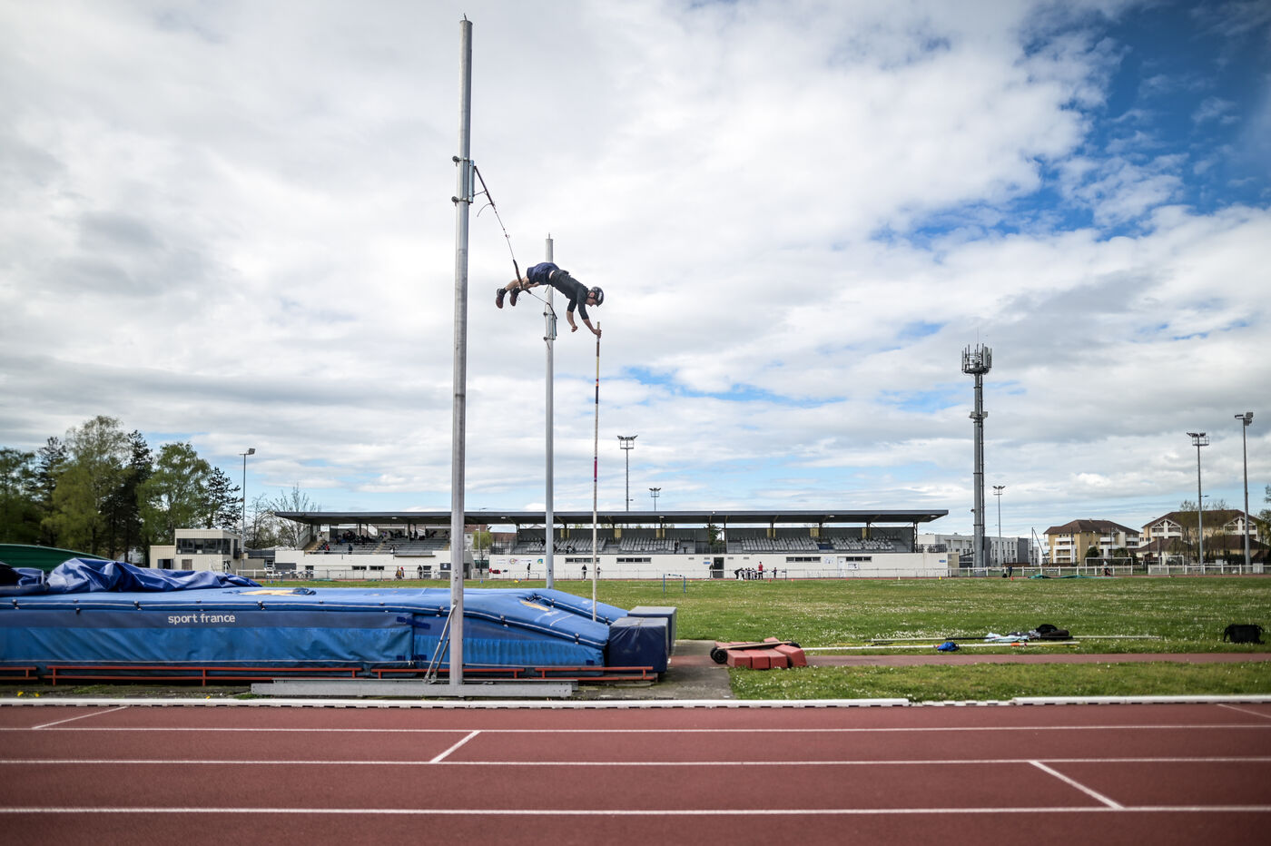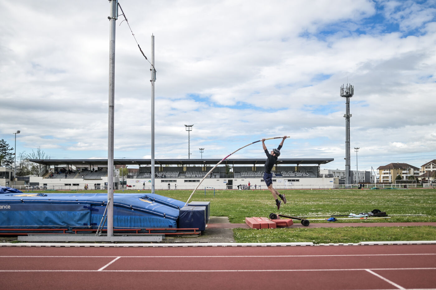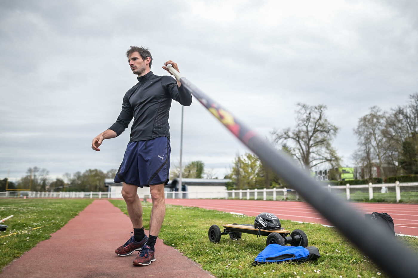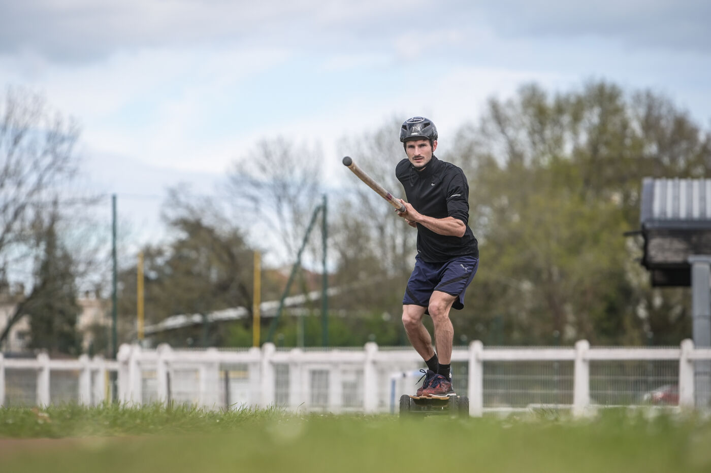 Baptiste Boirie, a physiotherapist in Laroin, near Pau, has been pole-vaulting since the age of 12. Passionate about skateboarding, he came up with the idea of combining the two disciplines. The skateboarding technique is the same as that of the classic pole vault. The difference lies in the few centimetres gained with the height of the skateboard, and above all in the constant speed enabled by the batteries during the run-up. Stable trajectory at constant speed: no energy is wasted in this phase of the jump. His personal best is 6.17 meters.
