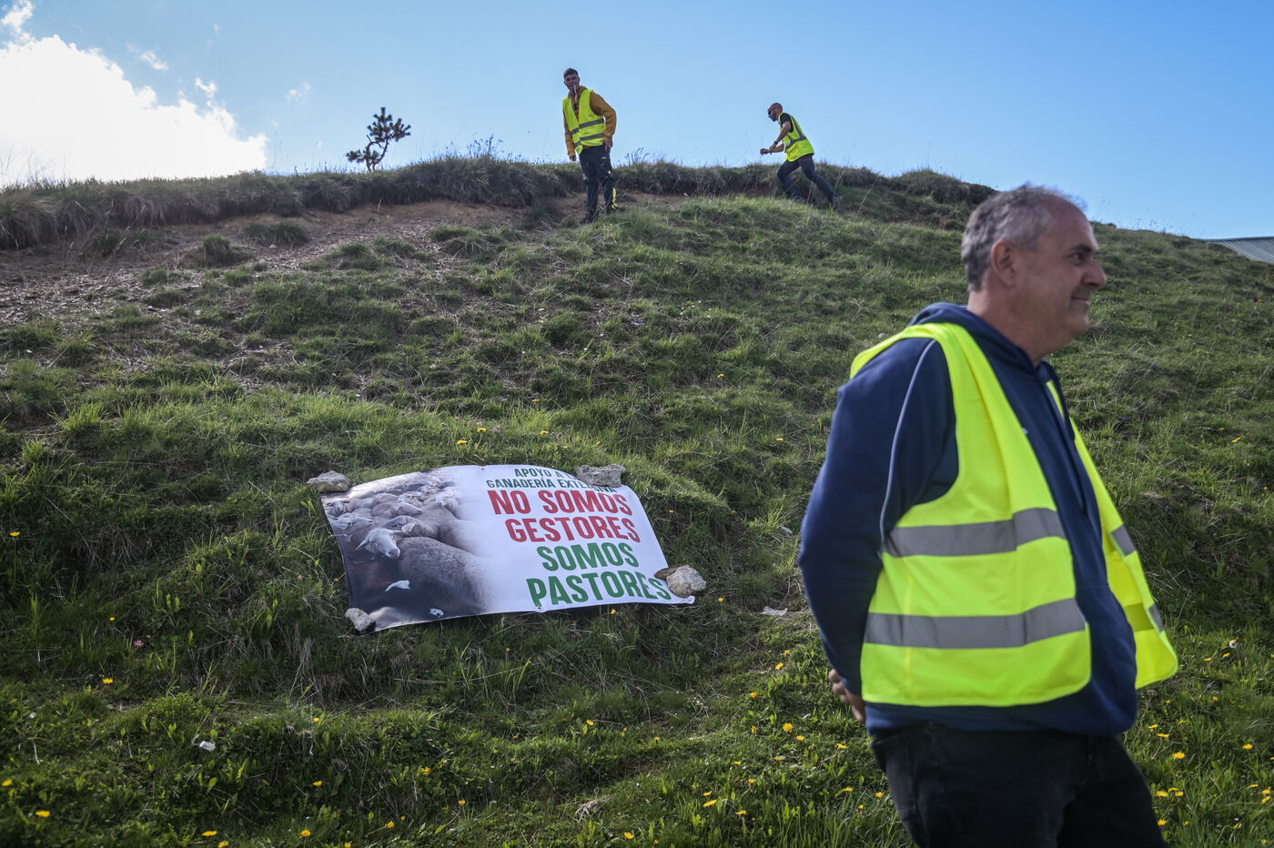 France, Col du Pourtalet, 2024-06-03. Les agriculteurs français et espagnols ont débuté une action coordonnée des deux côtés de la frontière entre la France et l'Espagne au col du Pourtalet dans les Pyrénées Atlantiques. Plusieurs dizaines de paysans espagnols (en gilets jaunes) et un peu moins de leurs homologues français (casquettes jaunes) étaient présents ce lundi matin. Au programme: blocage de la circulation des poids lourds, filtrage des voitures, barbecue. Le mouvement de contestation devrait durer 24h. Ils dénoncent les contraintes européennes et ce qu?ils estiment être des promesses non tenues par le gouvernement français. La CR 64 réclame toujours le GNR à 1 euro TTC.