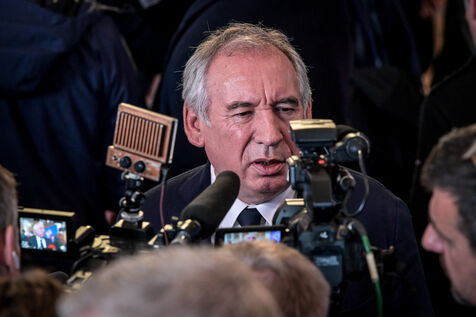François Bayrou, mayor of Pau, president of the Pau Bearn Pyrenees urban community, president of the communal center of Social Action and prime minister presents his wishes to municipal staff in the ballroom of the Palais Beaumont in Pau on January 20, 2024. Here taking selfies with municipal agents. An illustration of the accumulation of mandates and the omnipresence of the politician in Paris and in the provinces. Here in an interview with national and local media.