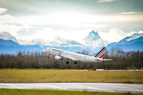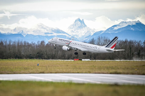 A plane from the Air France HOP company takes off on the tarmac of Pau Pyrenees airport in Uzein on January 29, 2025. Gaining altitude above the snow-capped mountains of the Pyrenees and the Pic du Midi d'Ossau, the aircraft, an Embraer E 190, is captured in full flight in a bright sky, with a backdrop of snow-covered peaks. An illustration of short and medium-haul flights or connections, flights to reach Paris from the territories or the province.