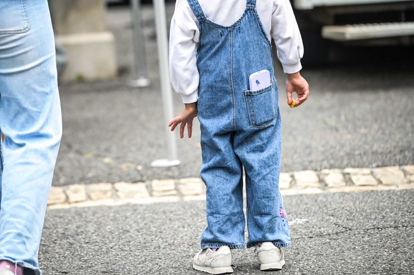 Un enfant en salopette en jean et baskets blanches marche dans un marché à Navarrenx le 27 aout 2025. Dans sa poche arrière, un smartphone dépasse, symbole de l’omniprésence du téléphone portable et du numérique dès l’enfance. Cette scène de rue illustre la vie quotidienne, la mixité générationnelle et les usages précoces des écrans. À travers cette image de marche et de dos, on perçoit l’enfance connectée, le lien entre société et technologie, au cœur de la ville et de l’espace urbain.