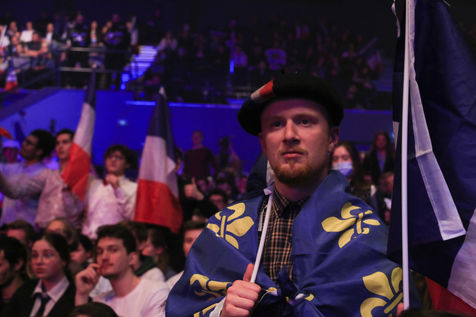 France, 2022-04-07. Le candidat du parti Reconquete Eric Zemmour lors de son dernier meeting de campagne avec le collectif Les Jeunes avec Zemmour au Palais des Sports. Photographie de Quentin de Groeve / Hans Lucas