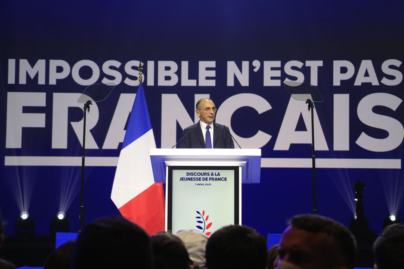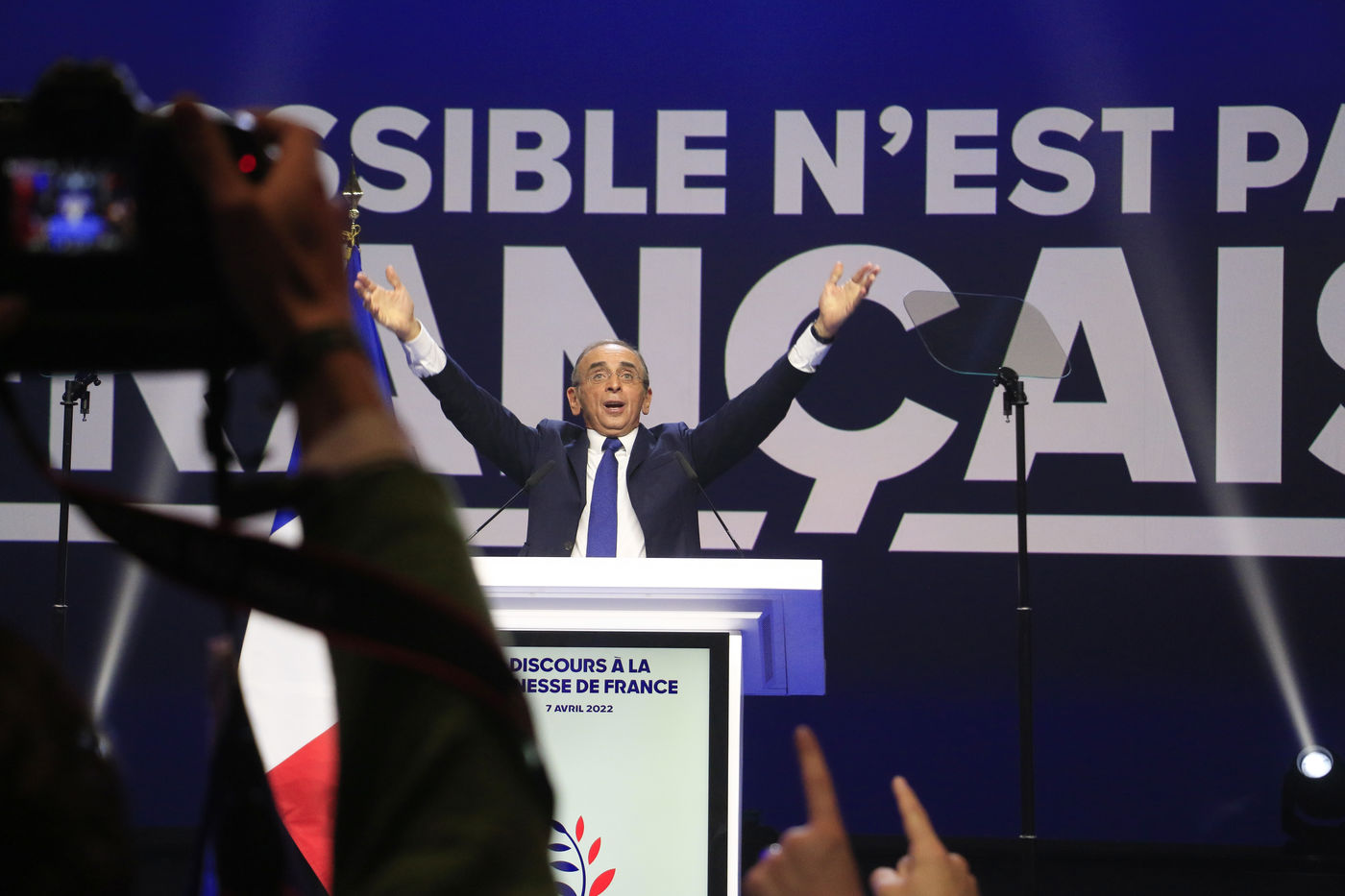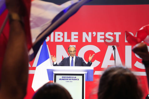 France, 2022-04-07. The Reconquete party candidate Eric Zemmour during his last campaign meeting with the collective Les Jeunes avec Zemmour at the Palais des Sports. Photograph by Quentin de Groeve / Hans Lucas
