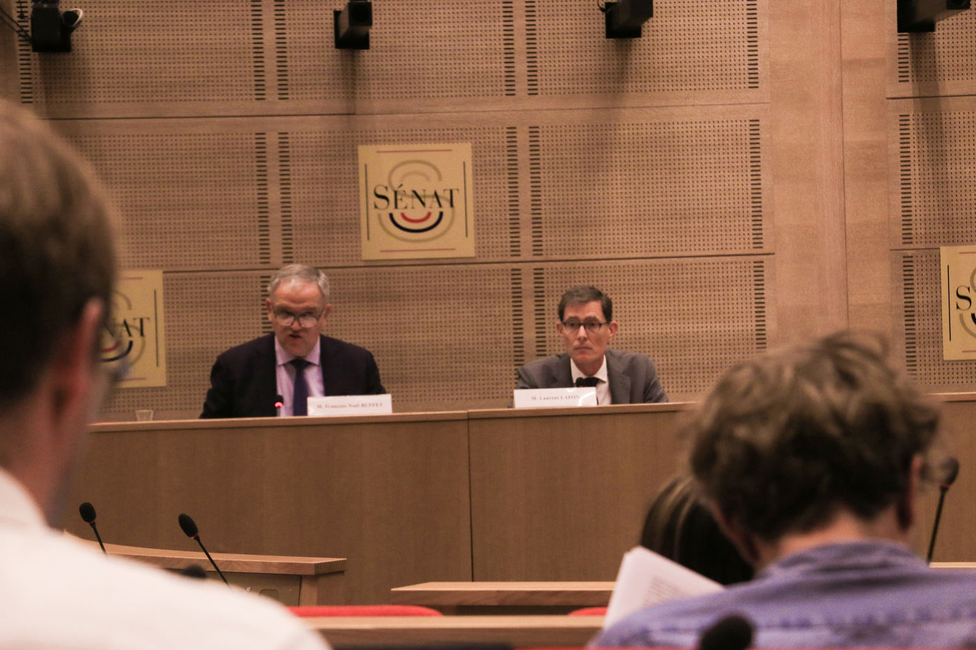 France, 2022-07-13. Francois-Noel Buffet et Laurent Lafon donnent une conference de presse pour la conclusion du rapport sur les incidents au Stade de France. Photographie de Qentin de Groeve / hans Lucas