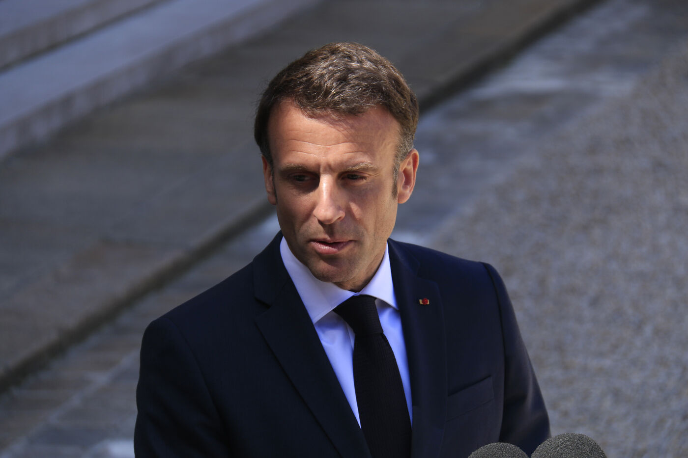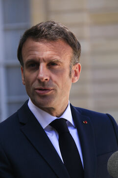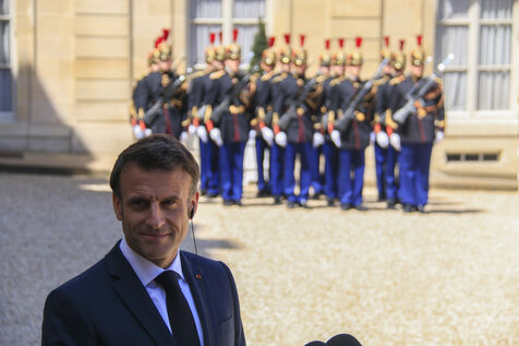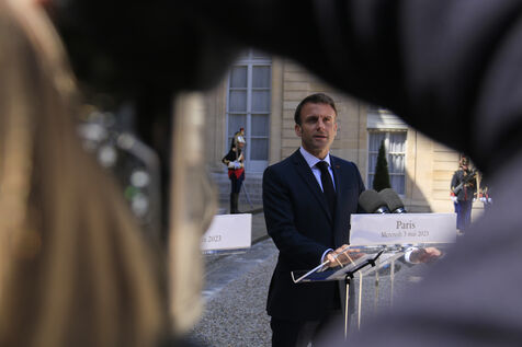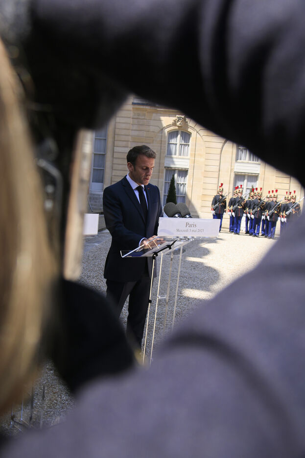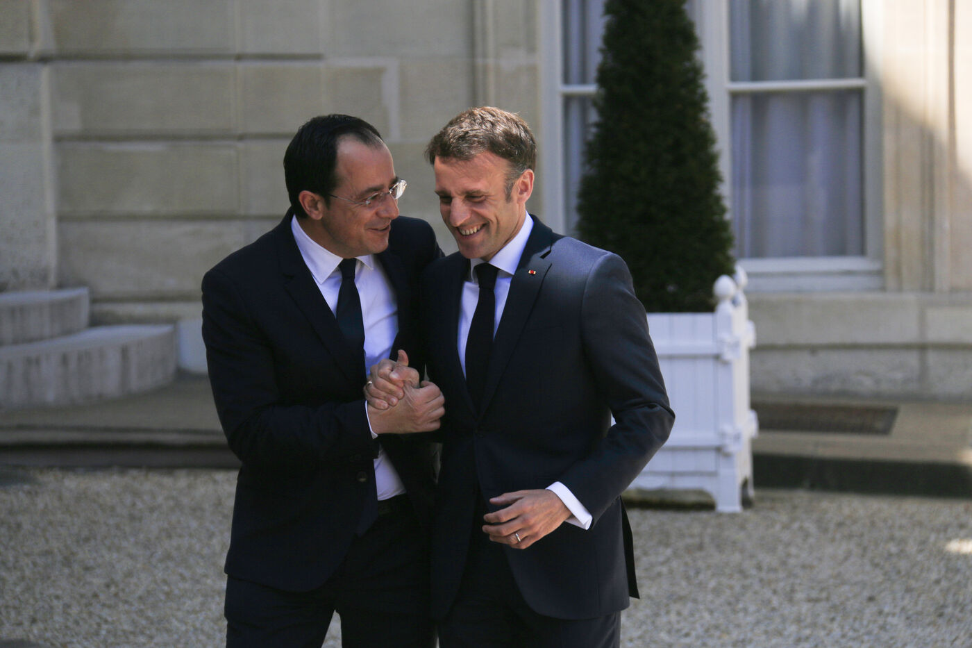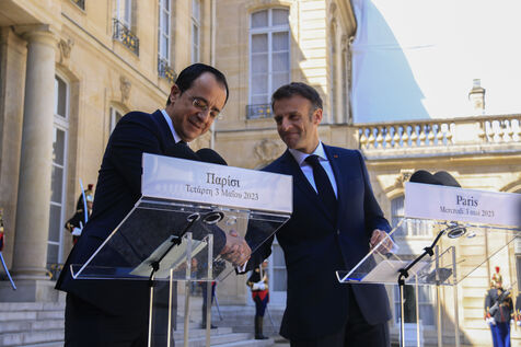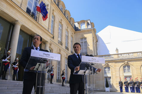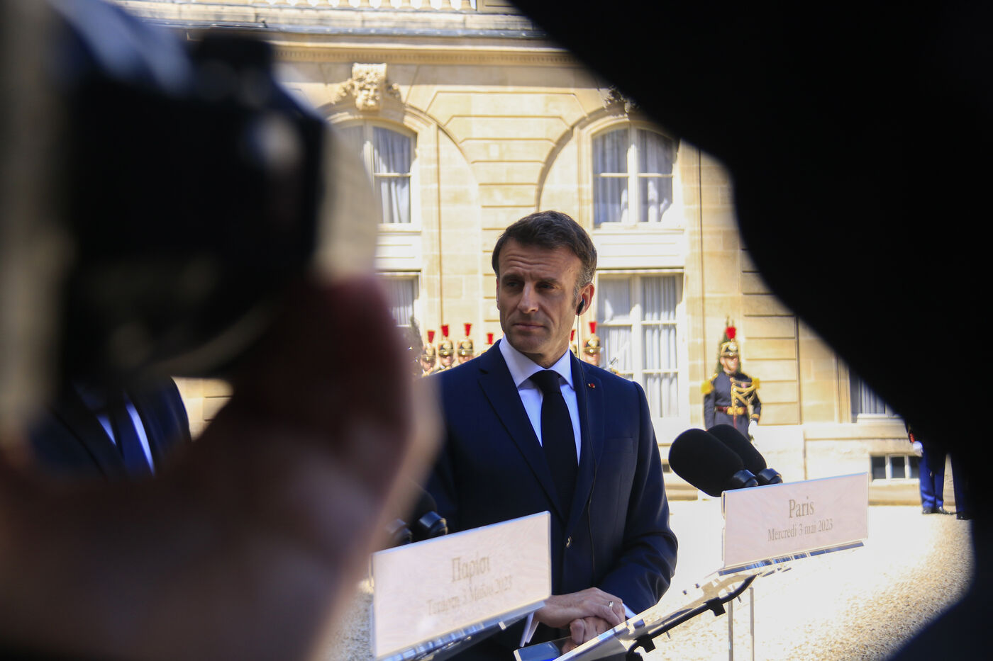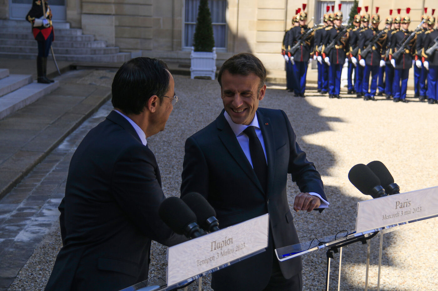 France, Paris, 2023-05-03. French President Emmanuel Macron and the President of Cyprus Nikos Christodoulides at the Elysee Palace. Photograph by Quentin de Groeve / Hans Lucas