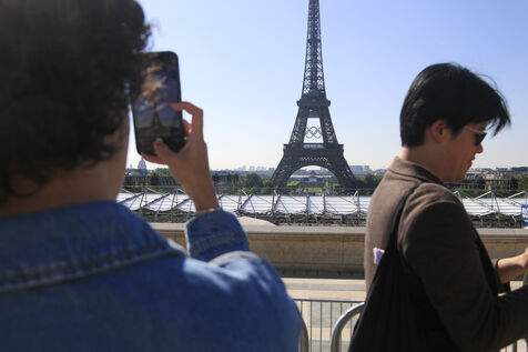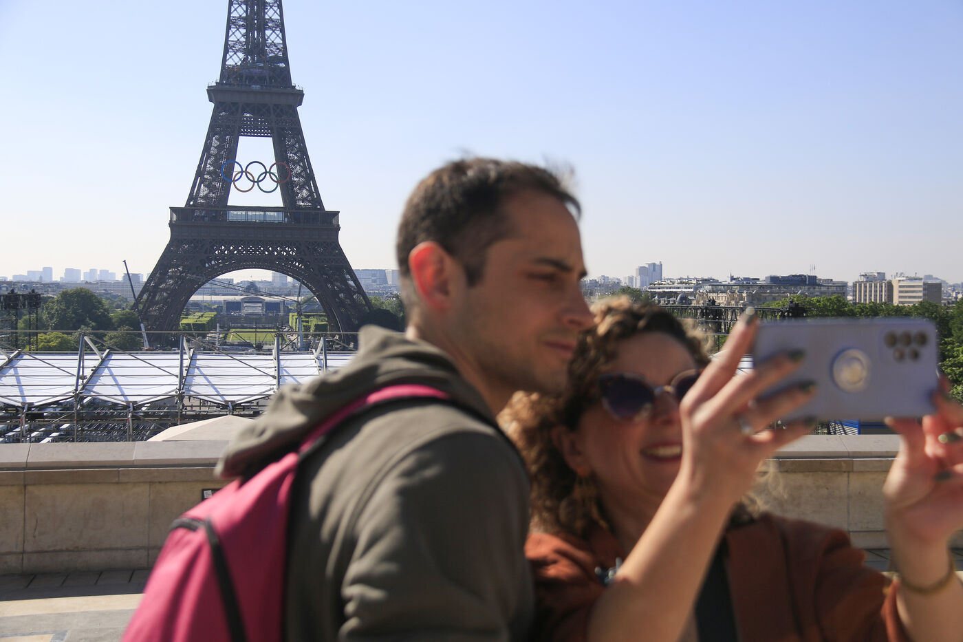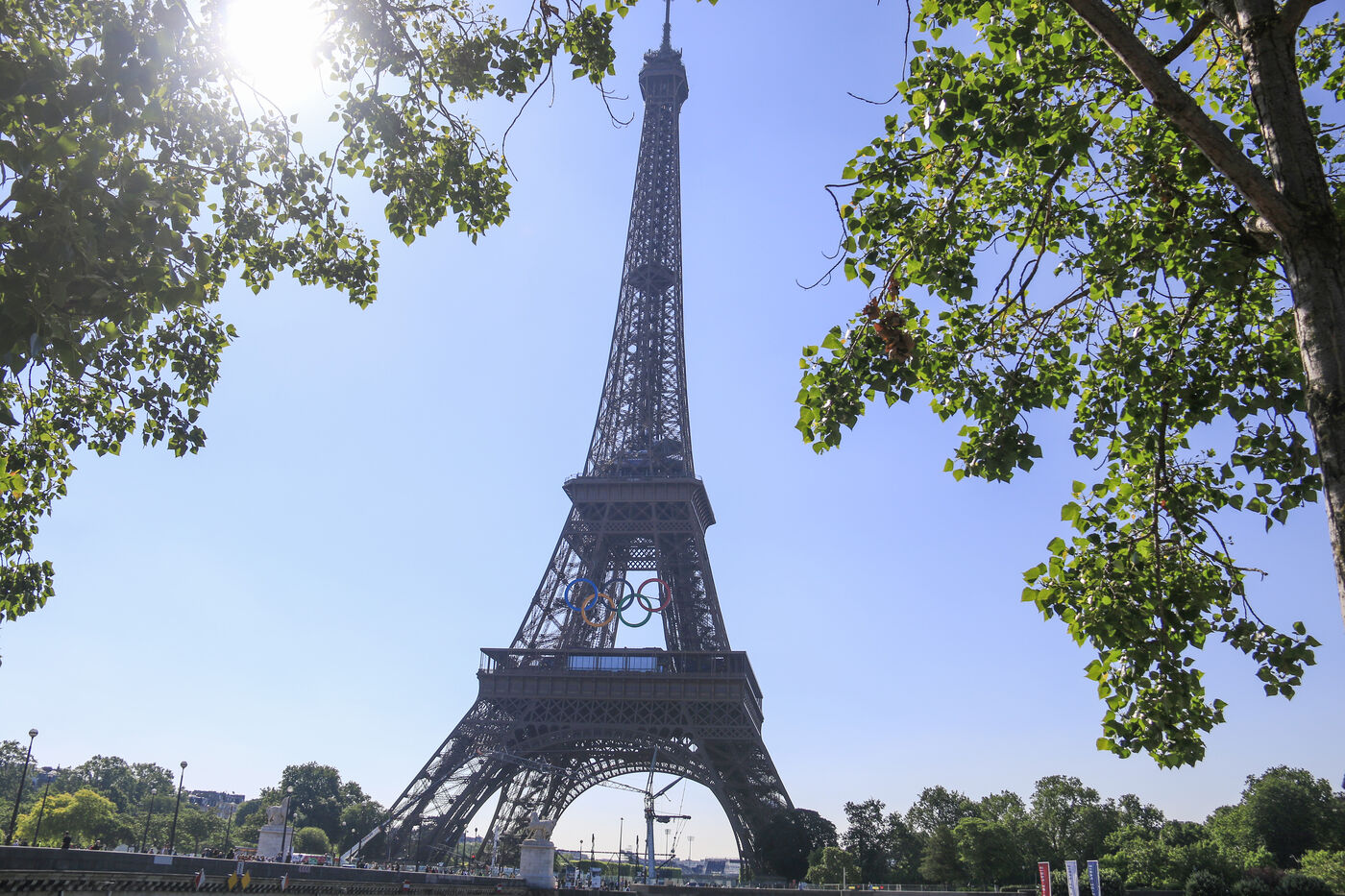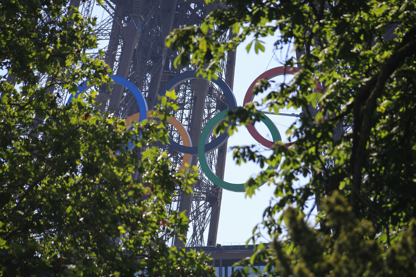 The Olympic rings were installed on the Eiffel Tower for the 2024 Games in Paris on June 7, 2024.