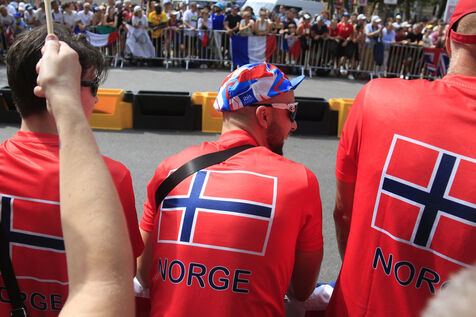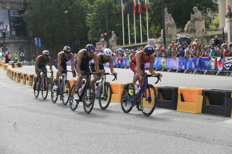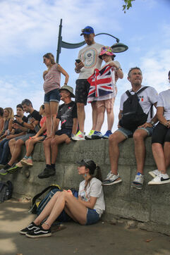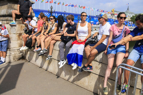 Supporters during the Men's Triathlon at the Quai d'Orsay for the Olympic Games in Paris on July 31, 2024.