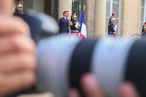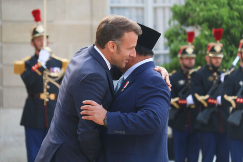 French President Emmanuel Macron receiving Indonesian President Prabowo Subianto for a working dinner at the Elysée Palace in Paris on July 14, 2025.