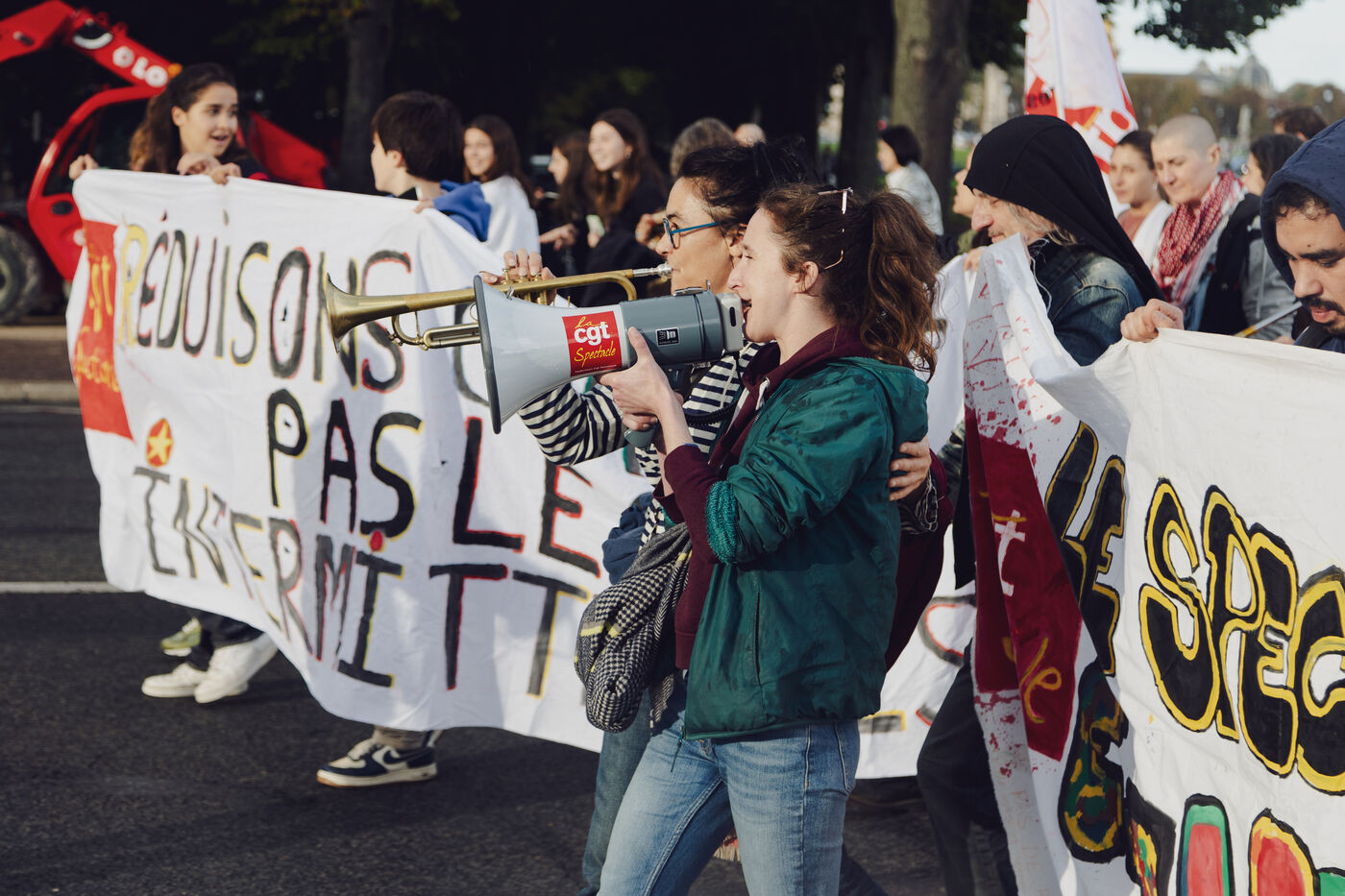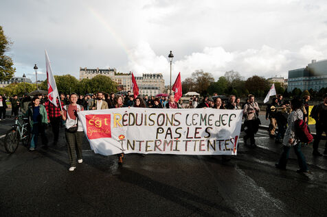 Manifestation des intermittents du spectacle contre la casse de l'assurance chômage durant les négociations avec le MEDEF et le patronat qui demande 15% d'économies sur les annexes 8 et 10 de l'assurance chômage.