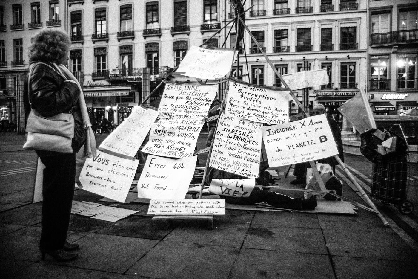 En novembre 2011, la place des Terreaux à Lyon devient le centre d'une occupation marquante, faisant écho aux mouvements mondiaux d'Indignés nés après les révoltes de la place Tahrir au Caire et l'occupation de Wall Street à New York. Cette mobilisation lyonnaise rassemble des citoyens unis par leur opposition aux inégalités sociales et économiques, exprimant leur mécontentement face aux dérives du système économique mondial.