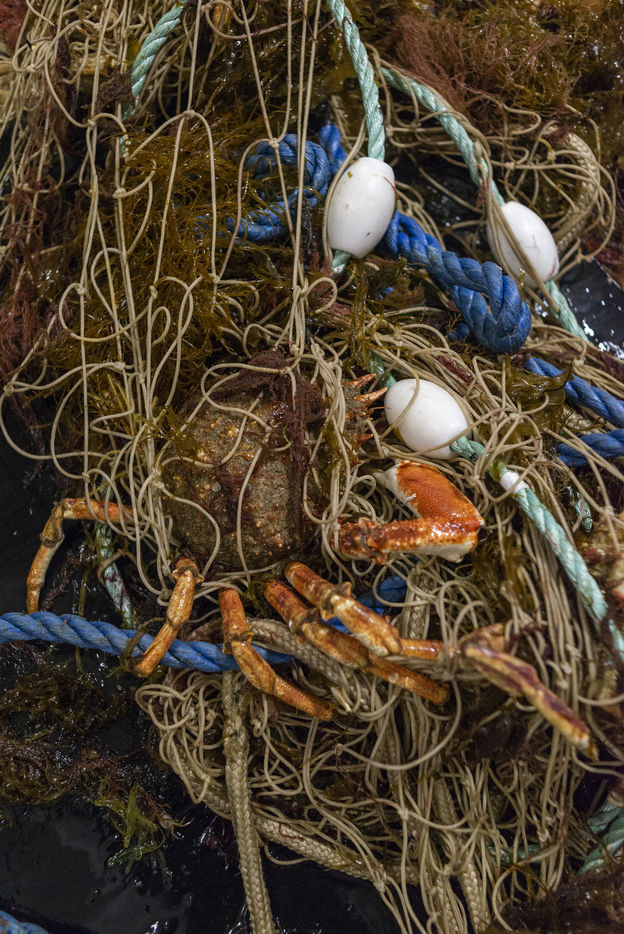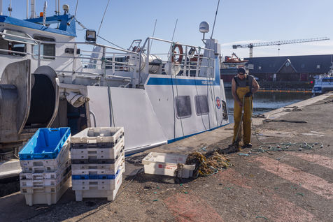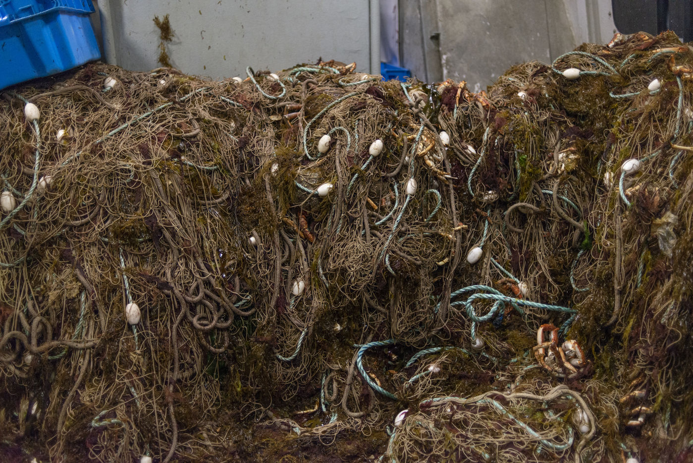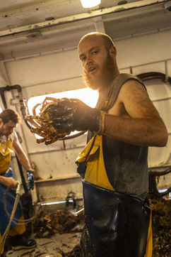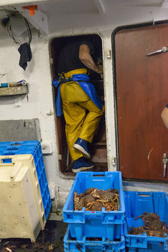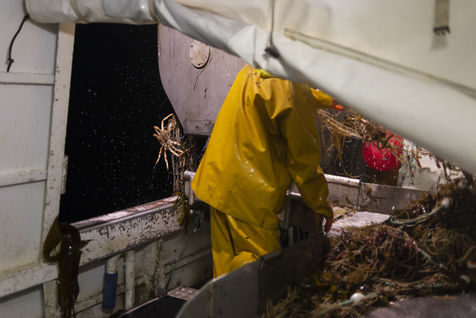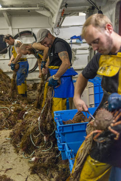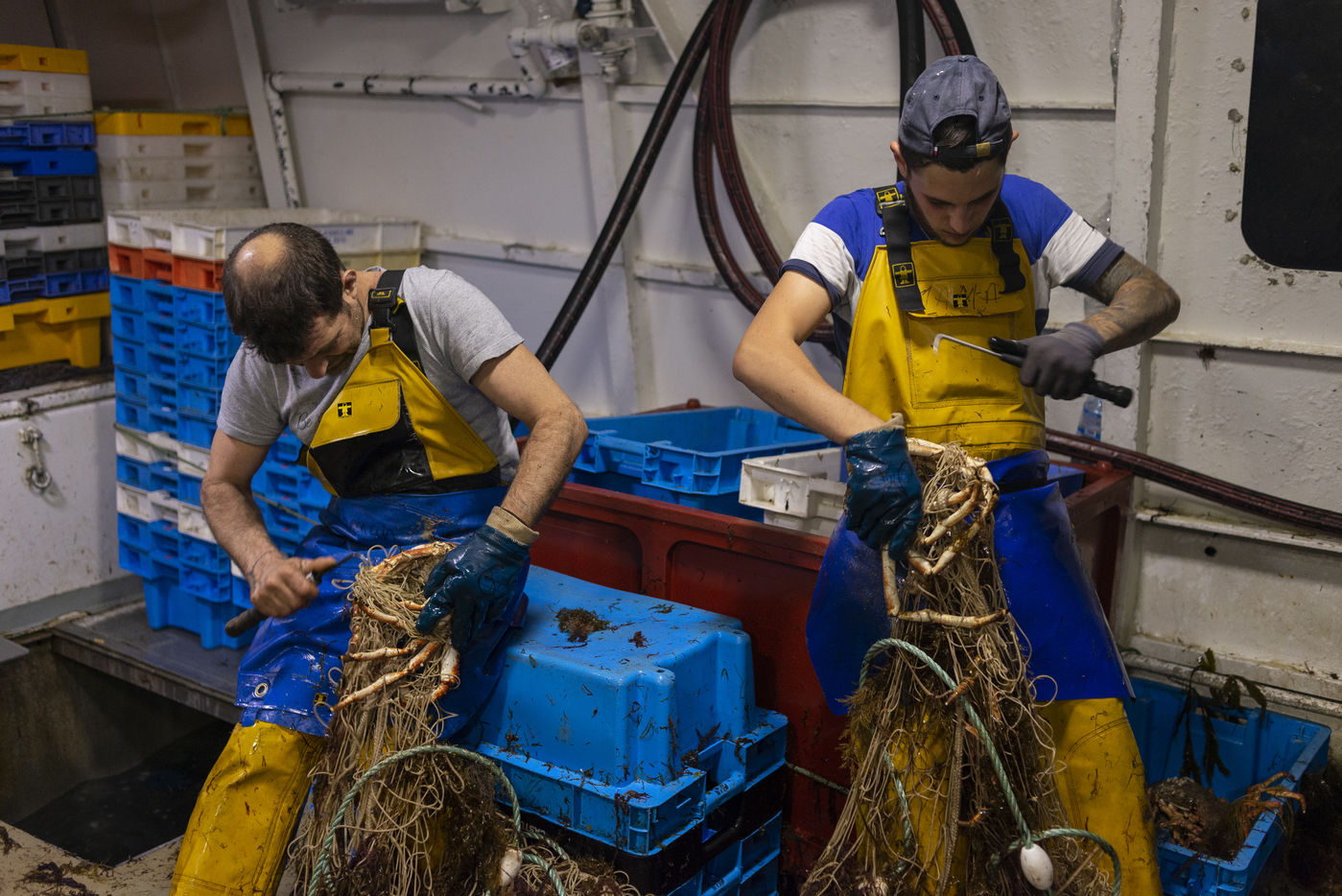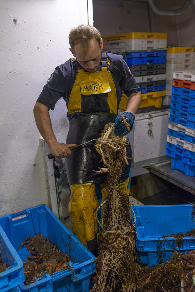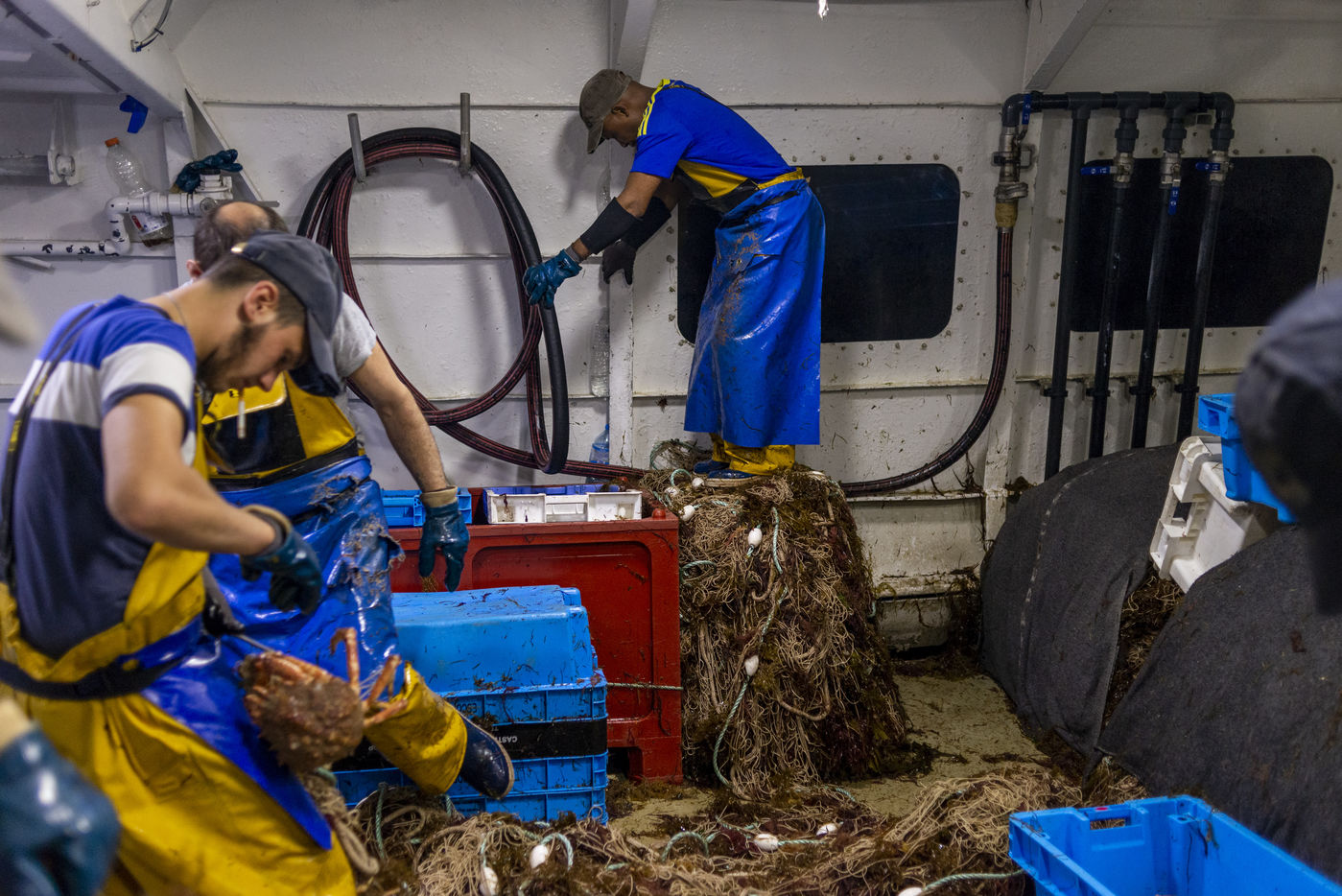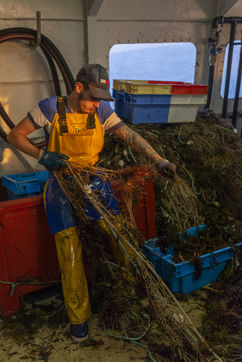 Spider crab's fishing is done with nets, we put down nets of two times 2 kilometers that we come to recover a few days later. The spider crab gets caught in the net and twisted, then it is up to the fishermen to remove them with a tool also called gutter. It is a tiring work, one repeats the same gestures, which in the long run can generate chronic tendinitis while lifting heavy loads. It is a chain job on a boat in the open sea, constantly tossed by the swell. The boat does not leave for more than a day, it returns to port once the objective has been reached.