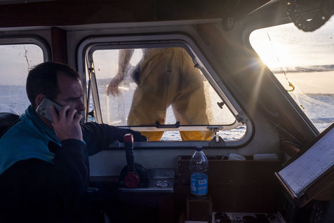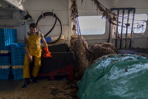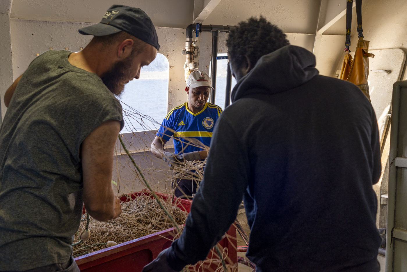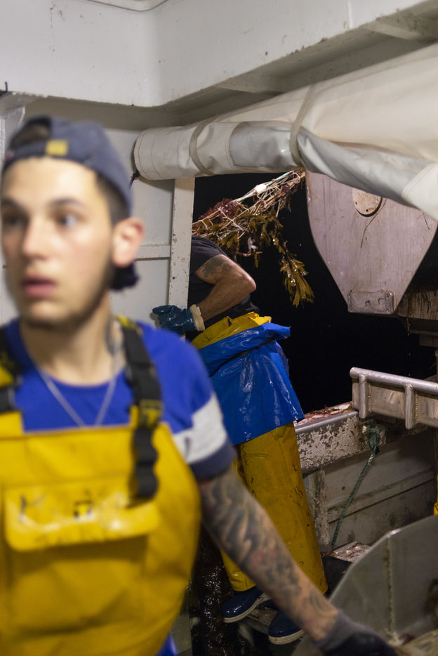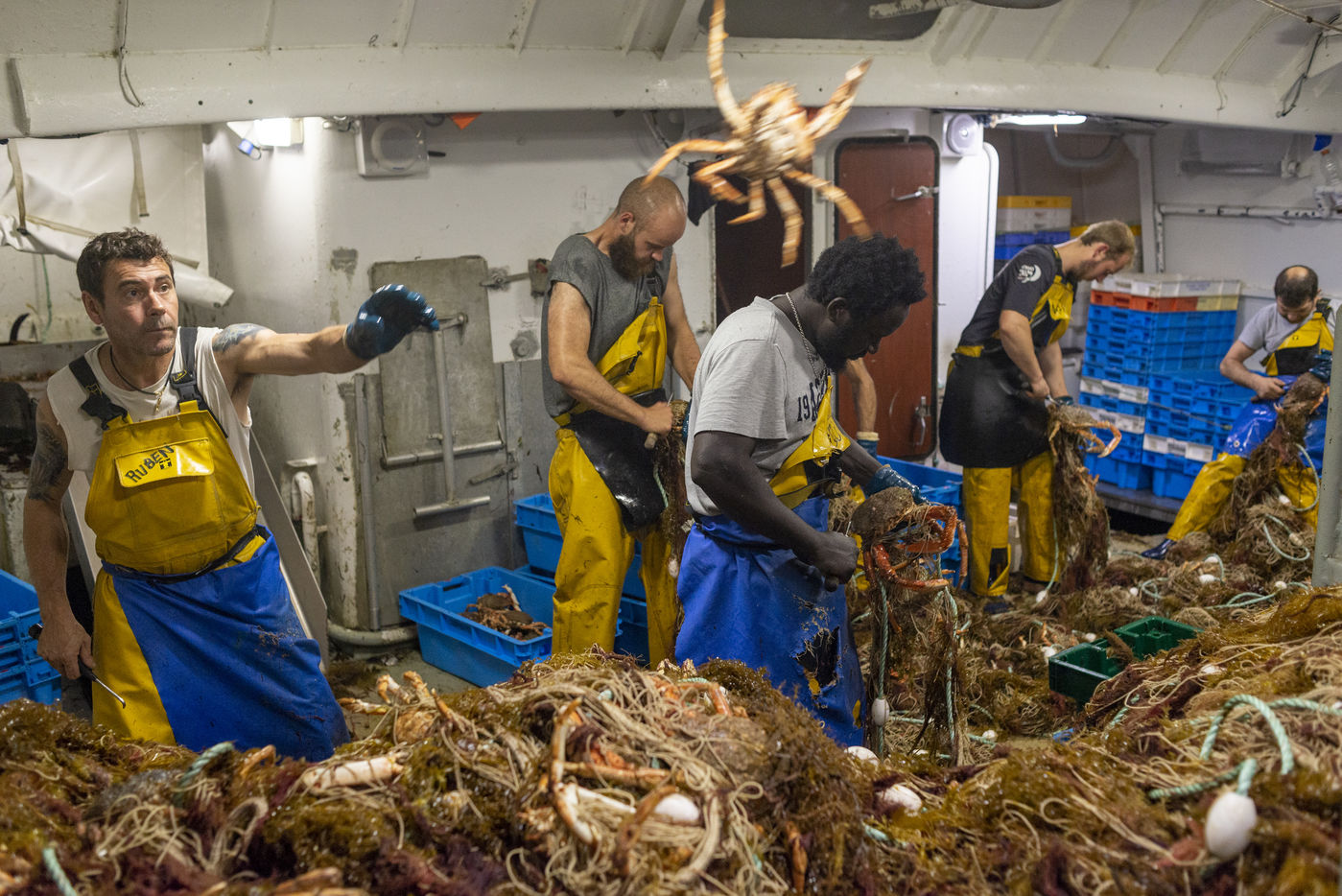 They are 9 on board. The youngest, Matthieu, just in his twenties, learns the trade from Nelson, the boat's second mate. He is Portuguese like Augusto and Abel who settled in Saint-Malo attracted by higher wages than in the country. Moussa, the oldest is 50 years old but looks 20 years younger, he comes from Senegal like Ousmane, they have been part of the crew for several years now. Coin-coin, the mechanic is from Saint-Malo like Michaël the thirty-something who has been in the business for 10 years now and hopes to buy his own boat soon.