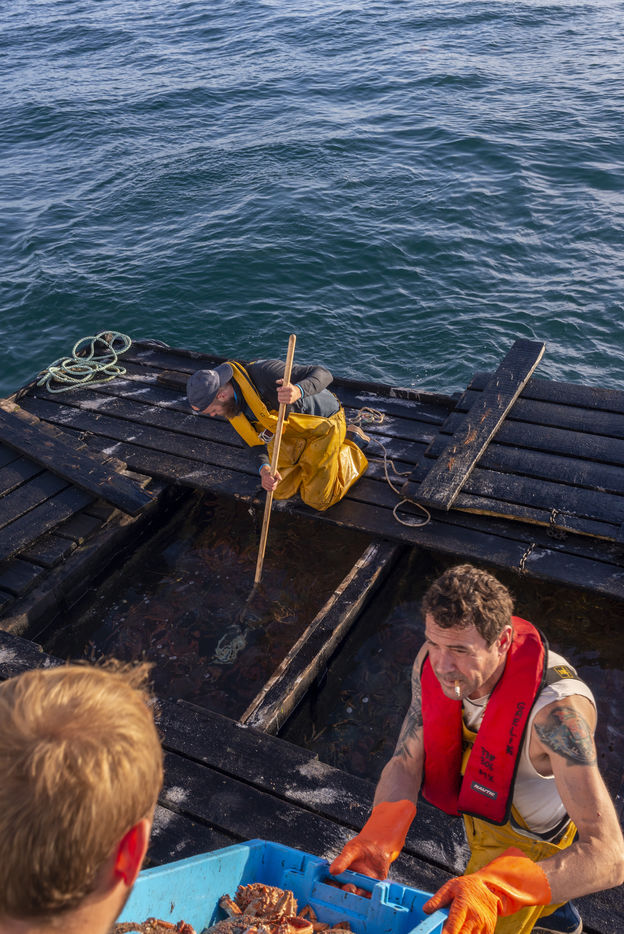 Given the expertise of the captain, the volume of sales and therefore the volume of the catch is anticipated. Today, it is a small sale which is planned, around 500 kilos however, Maxime plans to bring back no less than 2 tons! The surplus of spider crabs is stored in fish tanks at anchor. The spider crabs are distributed according to their sex. The males, larger and thus more sought-after, sell better than the females yet more fleshy, according to connoisseurs.