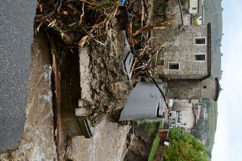 France, Chavanay, 2024/10/17. Red alert for floods and flooding in the Loire. Collapse of the Chavanay bridge. Photograph by Romain Doucelin / Hans Lucas.