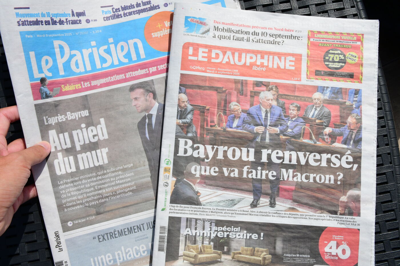 France, Clonas, 2025/09/09. Cover of the newspaper Le Dauphine Libération on the resignation of French Prime Minister François Bayrou and the end of the government. Photograph by Romain Doucelin / Hans Lucas.