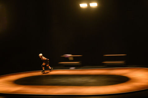 Performance of “Derby”, a collective creation by the UNA company, directed by Emmanuelle Hiron and Valia Beauvieux, at the Scène Nationale d'Orléans.