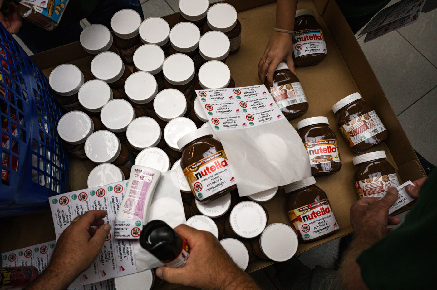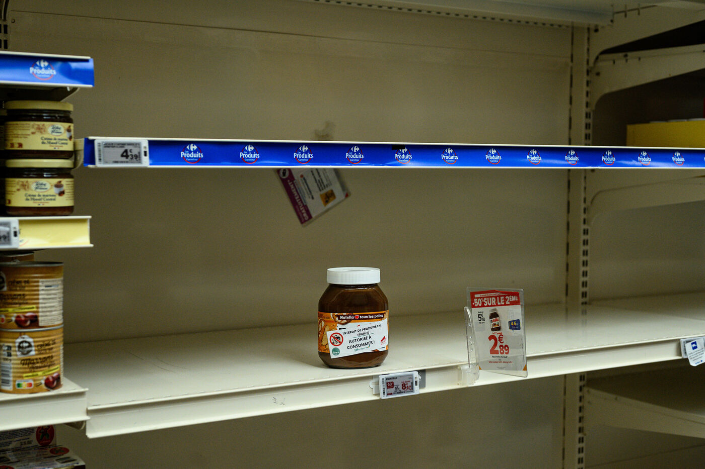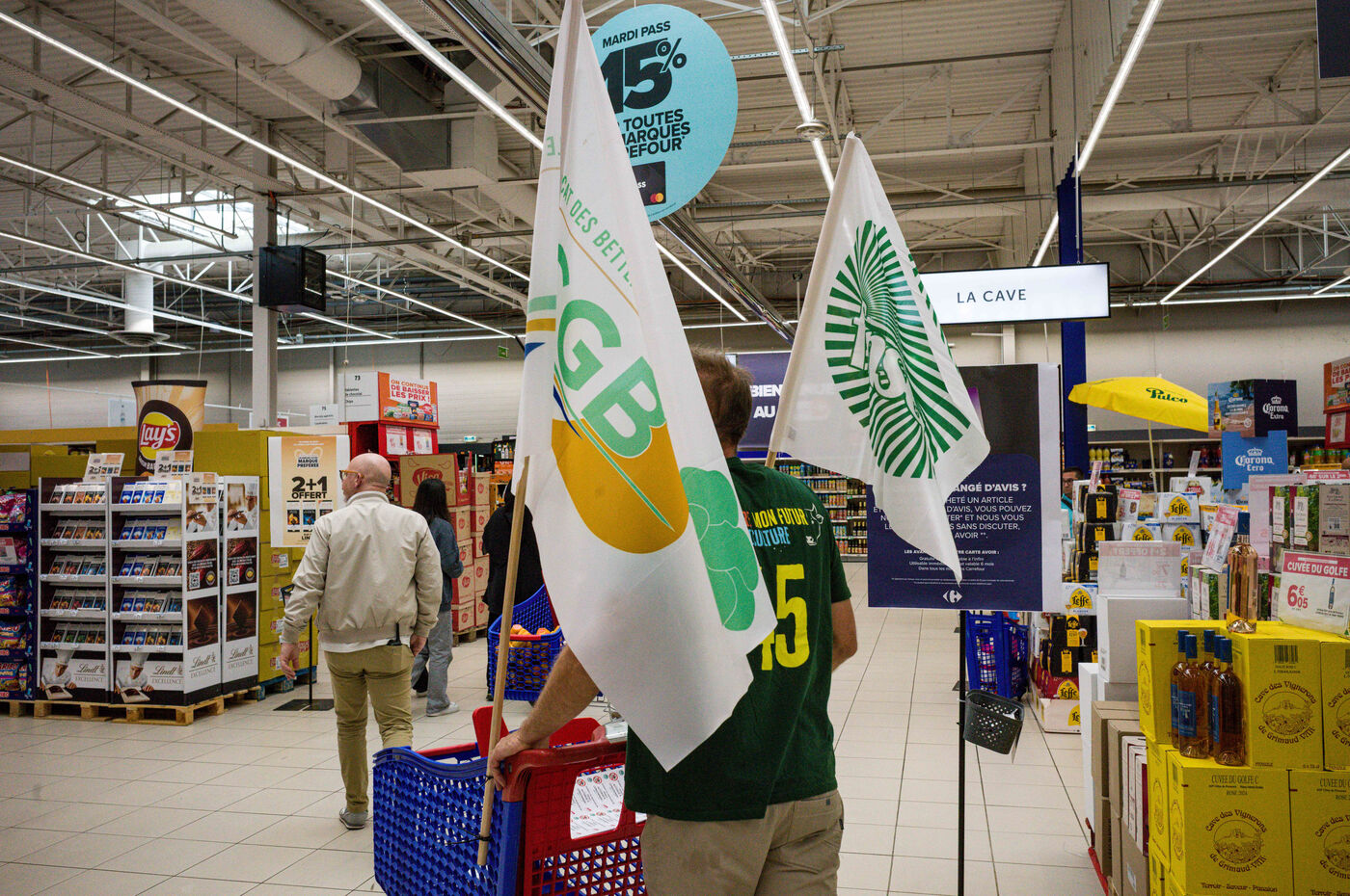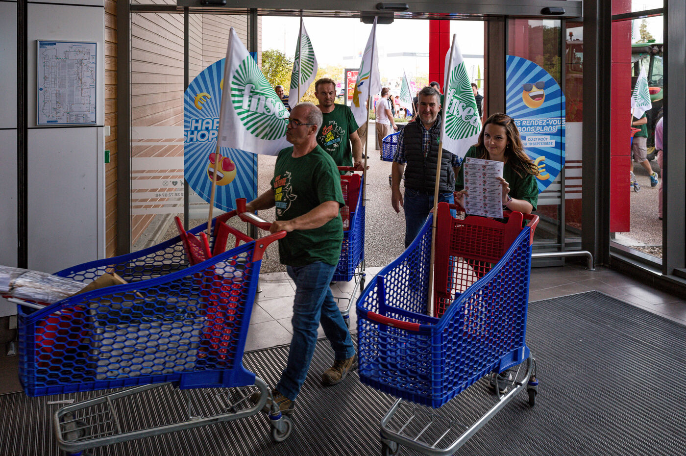 Action des agriculteurs dans un hypermarché Carrefour pour protester contre l'interdiction de l'utilisation de l'acétamipride en France.