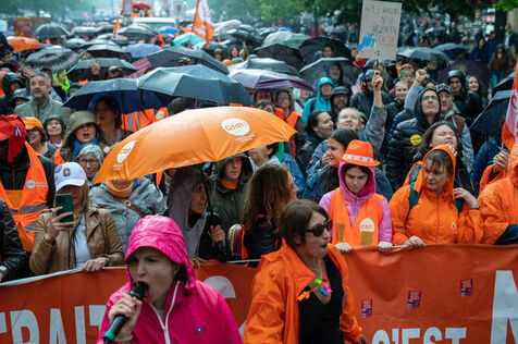 FRANCE, PARIS, 2023-05-01. Manifestation du 1er Mai a l occasion de la fete du travail entre la Place de la République et la Place de la Nation a l appel de l intersyndicale (dont CFDT, CGT, FO, CFE CGC). Les manifestants s opposent a la retraite a 64 ans et souhaitent des hausses de salaires.
