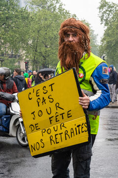 FRANCE, PARIS, 2023-05-01. May 1st demonstration for Labor Day from Place de la République to Nation called by labour inter-union and inter-professional unions CFDT, CGT, FO, CFE CGC. Demonstrators consider the retirement reform at age 64 and the need for pay raise should be the main focus of the government.