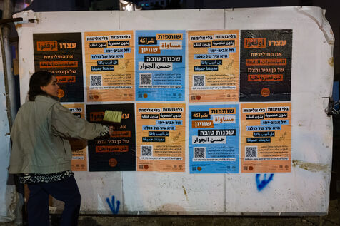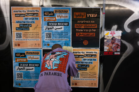 Left activists paste posters in Tel-Aviv Streets. No to racism, no to violence, Tel-Aviv Yaffo is for everyone. Stop the militias od Ben Gvir and Ha-Tzel. Partnership, equality and neigbourghness.