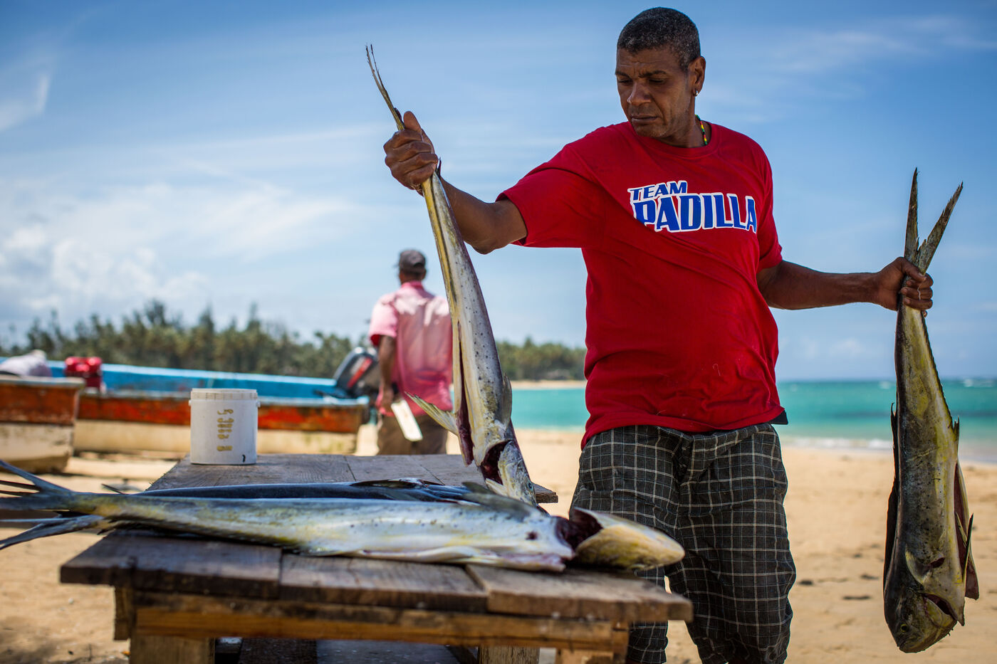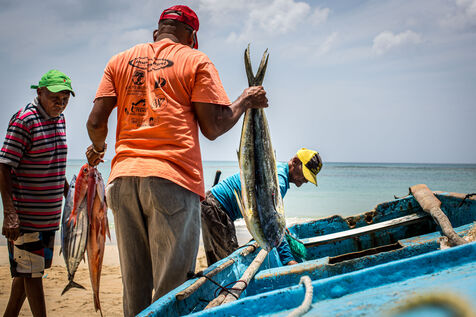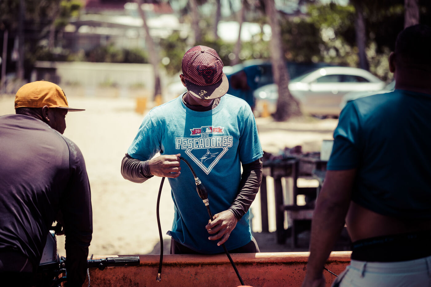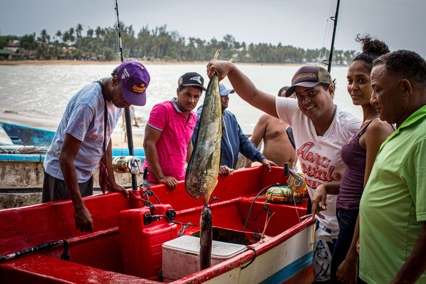 Sur la plage, les proches restés sur terre scrutent l'horizon, les chiens excités sentent le retour imminent des pêcheurs. Les hommes s'activent pour sortir leurs bateaux de l'océan atlantique en s'aidant de rondins de bois. Une fois débarqués, rapidement ils déchargent leur cargaison de poissons frais pour les nettoyer sur des tables en bois sur la plage et les proposer à la vente dans des cabanons à proximité. Toute une chorégraphie bien rodée se met en place, les plus jeunes et les plus vigoureux poussant les lourds bateaux, les plus anciens donnant leurs consignes. La solidarité entre confrères reste de mise. Certains produits, rares et précieux, comme le crabe royal appelé ici Santoyo, sont réservés avant la pêche et on vient les récupérer directement au plus près des barques. Les restaurants, les touristes et les autochtones seront tous rassasiés.