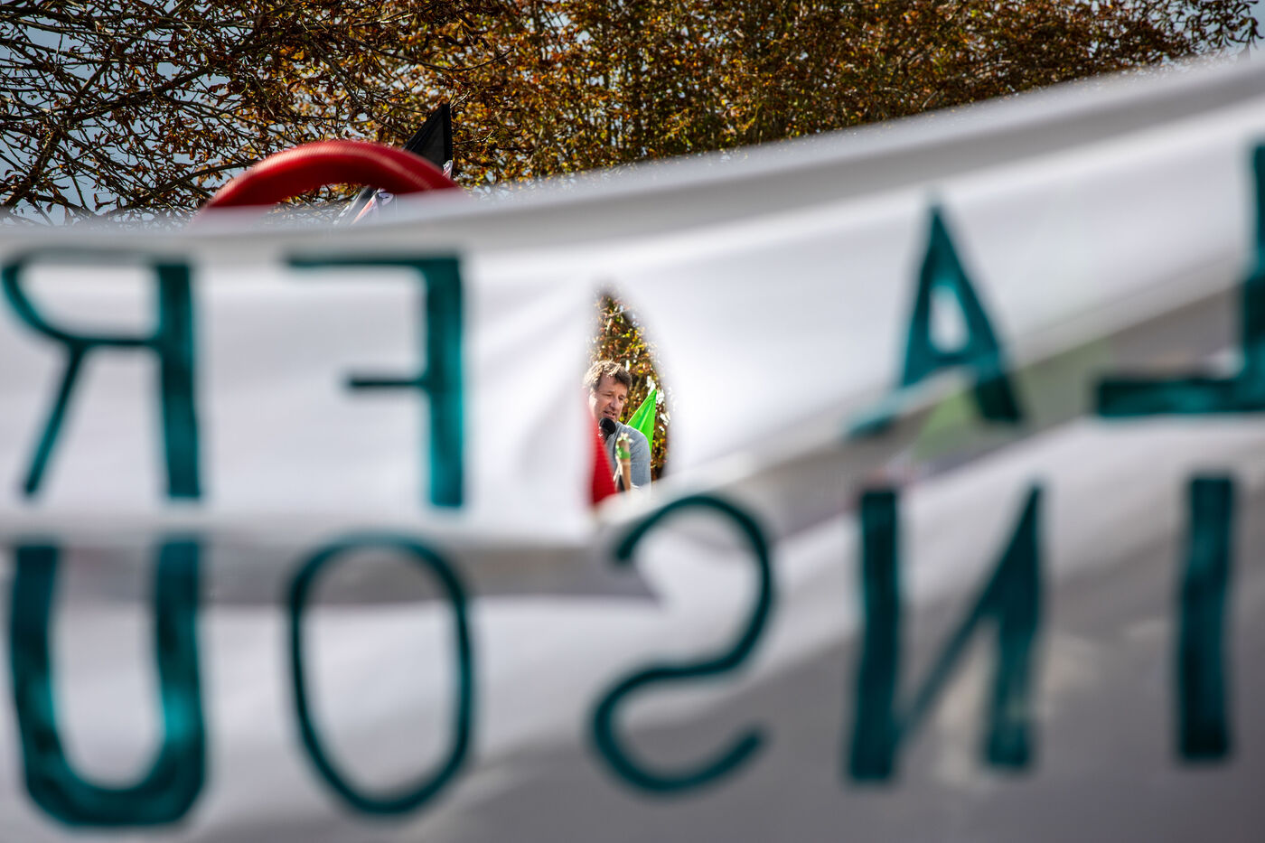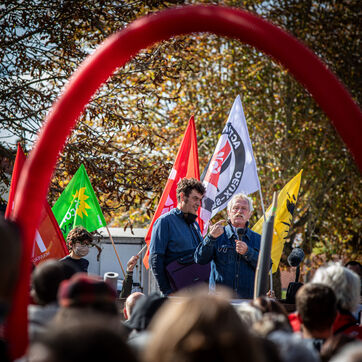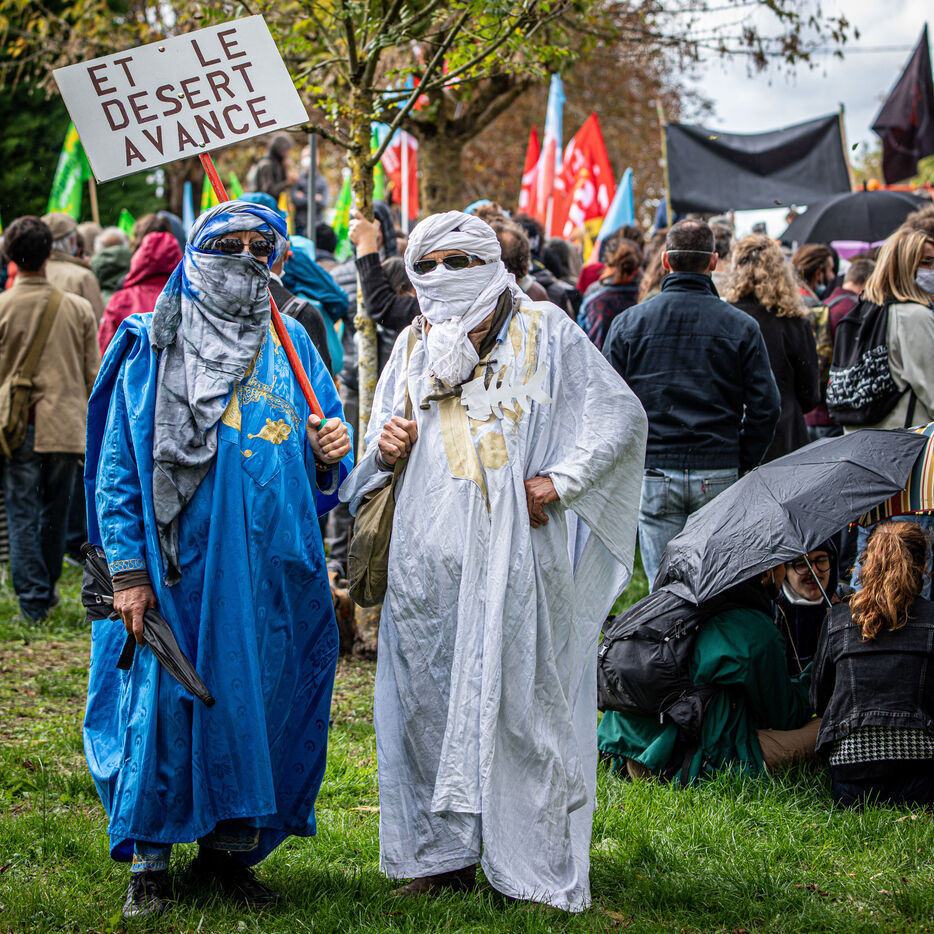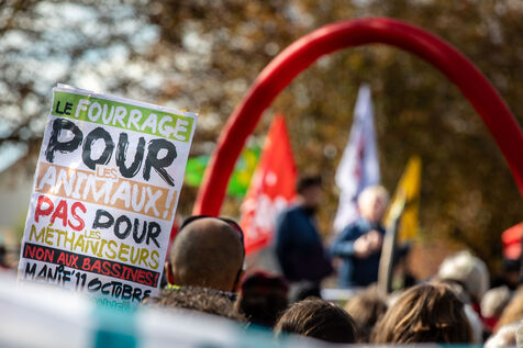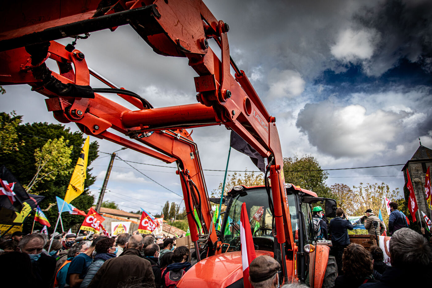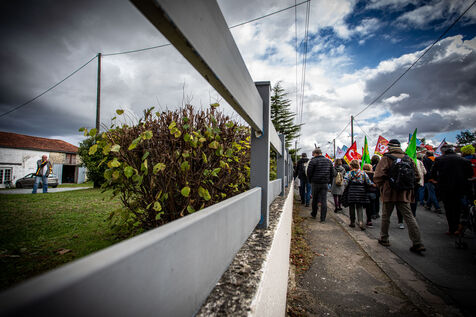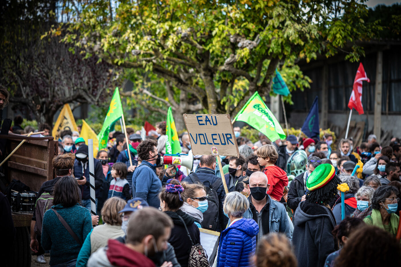 2800 people marched peacefully through the streets of Epannes in Deux-Sèvres, on the call of the Bassines Non Merci collective. Jean-Luc Mélenchon, leader of the political party La France Insoumise, Yannick Jadot, leader of the political party Europe Ecologie Les Verts, Philippe Poutou, leader of the political party le Nouveau Parti Anticapitaliste and José Bové, anti-globalization figure took to the microphone to denounce the megabasin projects, which they see as an environmental threat, on October 11, 2020.
