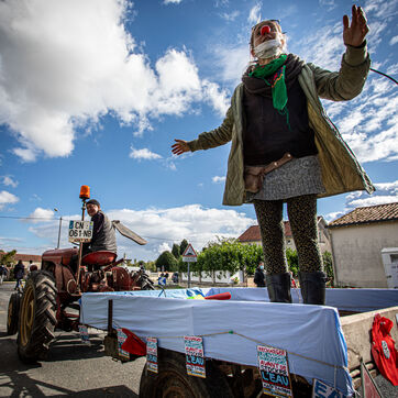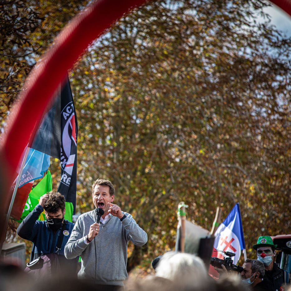 2800 personnes ont marché pacifiquement dans les rues d'Epannes en Deux-Sèvres, à l'appel du collectif Bassines Non Merci. Jean-Luc Mélenchon, leader du parti politique La France Insoumise, Yannick Jadot, leader du parti politique Europe Ecologie Les Verts, Philippe Poutou, leader du parti politique le Nouveau Parti Anticapitaliste et José Bové, figure altermondialiste se sont succédés au micro pour dénoncer les projets des mégabassines, menaces environnementales selon eux, le 11 octobre 2020.