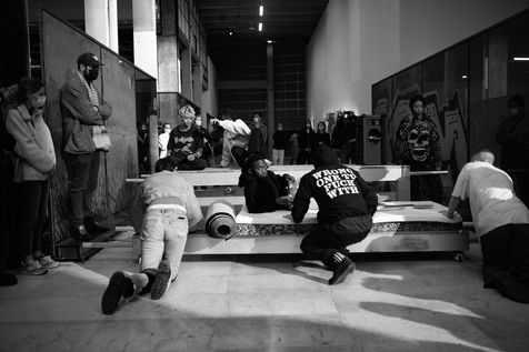Dans les espaces conçus par l'artiste pour son exposition carte blanche "Natures Mortes", les corps des performeurs se rassemblent, se mêlent, s'entrechoquent, avant de se disperser et de disparaître dans le public.