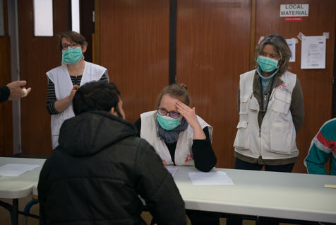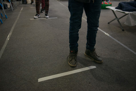 Évacuation du campement de migrants d'Aubervilliers le 24 mars 2020. Au 8ème jour du confinement en France lors de la pandémie de coronavirus, la préfecture évacue le campement de fortune où se trouvait plus de 500 personnes dormant dans des tentes.