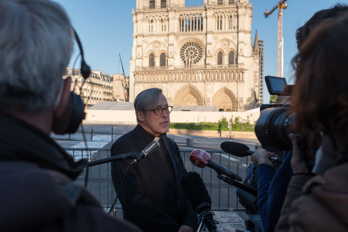 A few people approached near the cathedral to applaud and film the large bell that rings at 8 p.m. It marks the anniversary of the cathedral fire, when the French applaud caregivers during this period of the coronavirus epidemic. Rector Patrick Chauvet answers a few press interviews before 8 p.m.