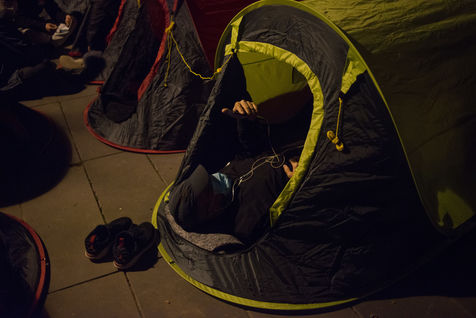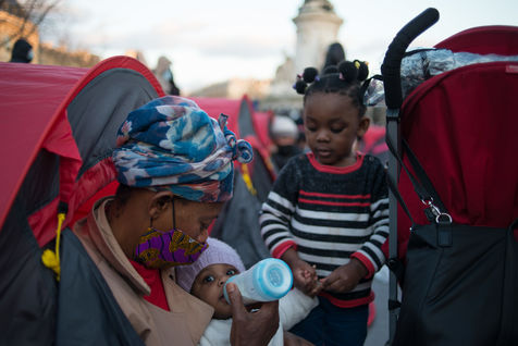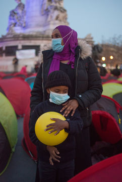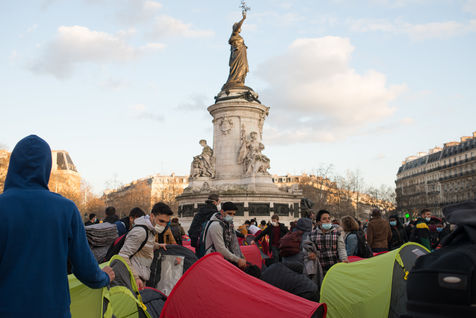 Un campement d'exilés s'installe à République pour "la Nuit de la Solidarté" à l?initiative de plusieurs associations afin de demander un hébergement immédiat, stable et décent pour les exilés, le 25 mars 2021 à Paris.