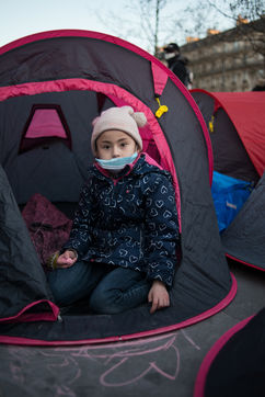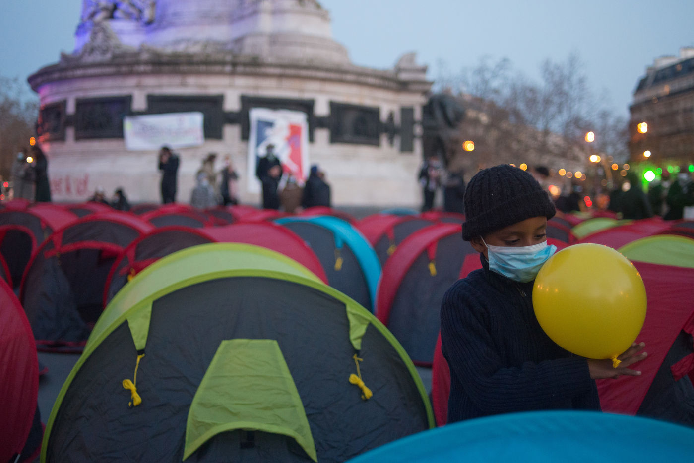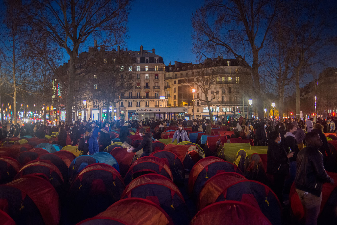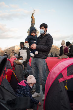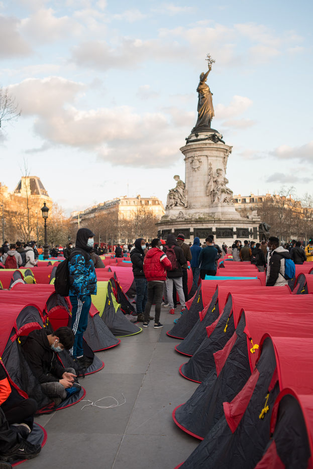 An exile camp settles in République for "the Night of Solidarity" at the initiative of several associations in order to "request immediate, stable and decent accommodation" for the exiles, on March 25, 2021 in Paris.