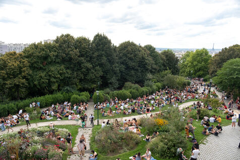 Festival Open Air géant avec DJ-set hits house, minimale et disco des collectifs parisiens Toilettes Mixtes & Cookies Records, à l'amphithéâtre du parc de Belleville, l'après-midi du 2 septembre 2023 à Paris.