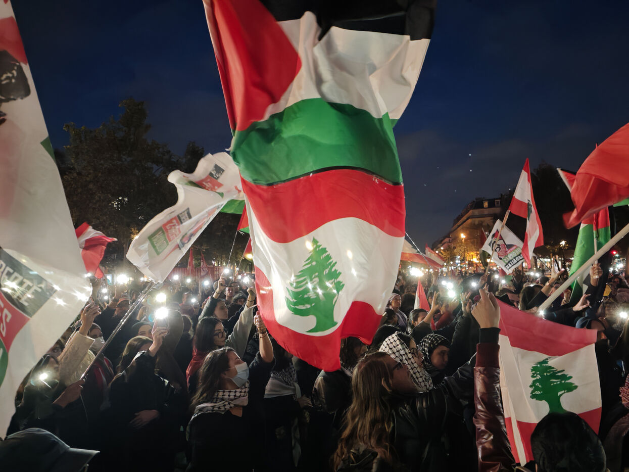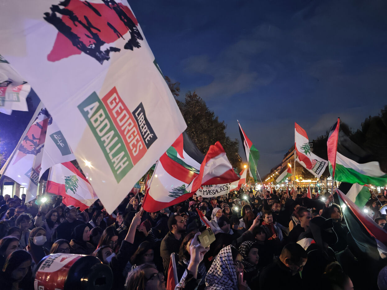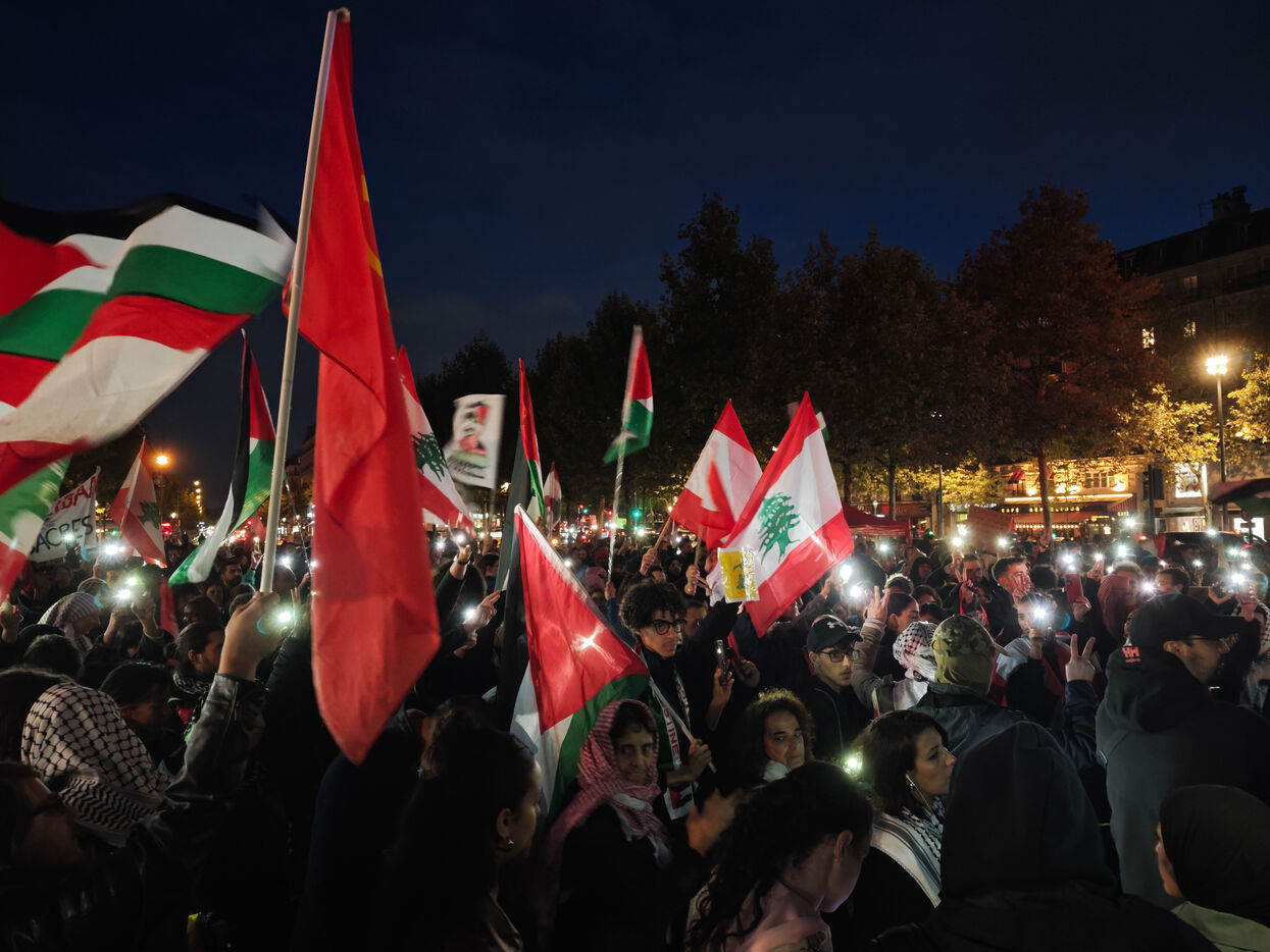 Demonstration against Israeli bombings of southern Lebanon and Gaza on Septembre 27, 2024 on the Place de la République in Paris.