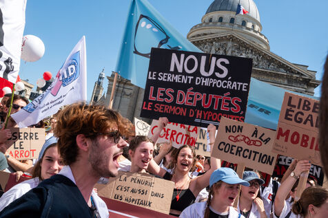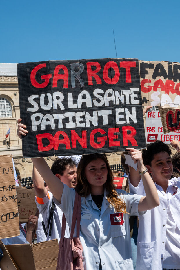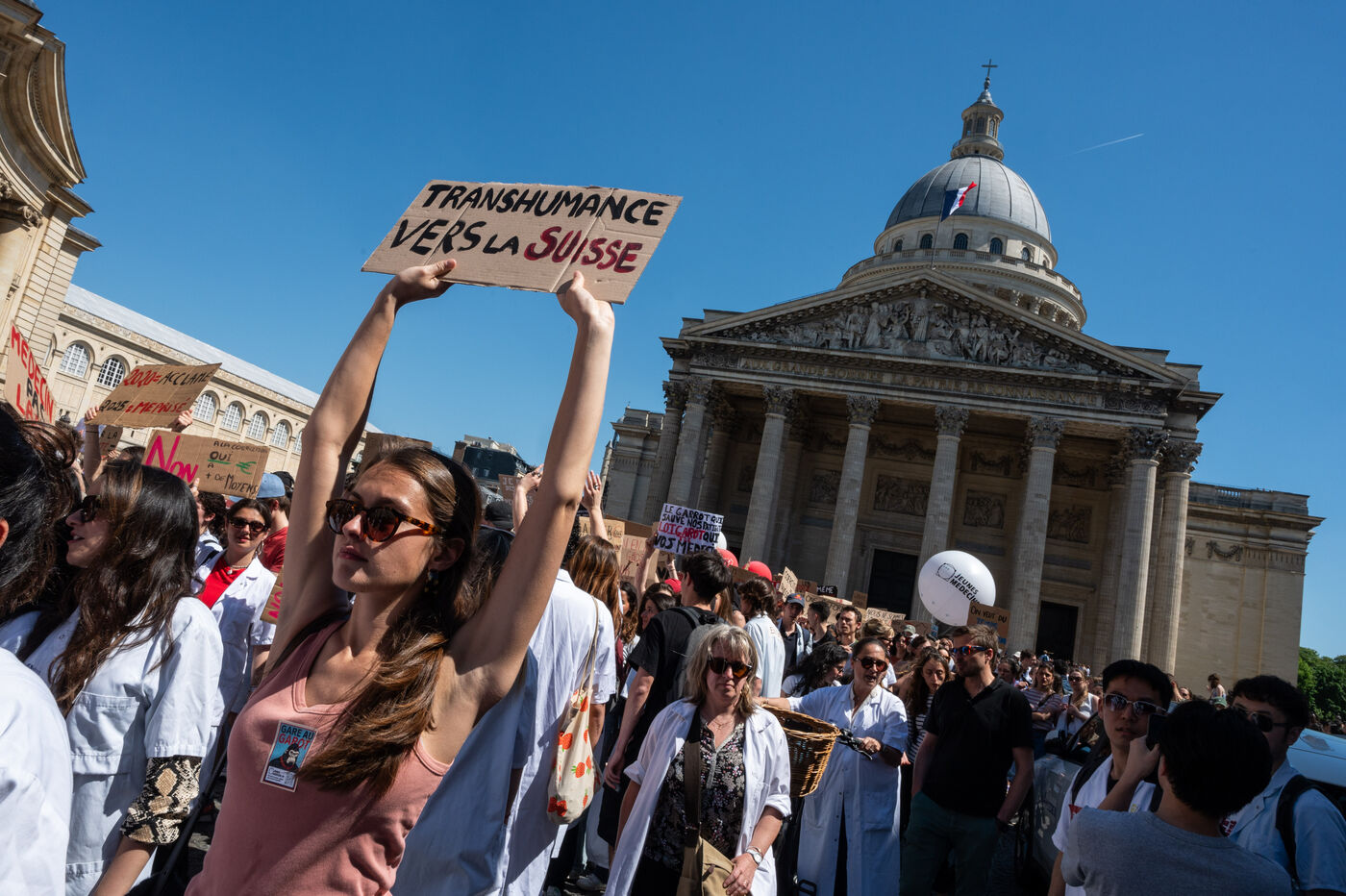 Demonstration in support of interns and in defense of private practice at Place du Pantheon in Paris. Unions of interns and young doctors are organizing a strike and a demonstration to defend freedom of establishment and private practice.