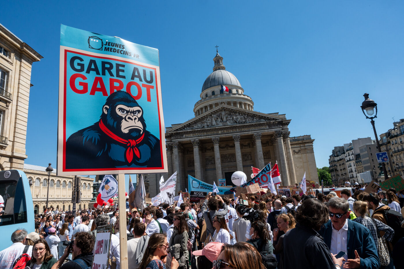 Manifestation en soutien aux internes et en defense de la médecine libérale à la Place du Pantheon à Paris. Les syndicats d’internes et jeunes médecins organisent une grève et une manifestation pour défendre la liberté d’installation et la pratique libérale.