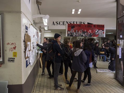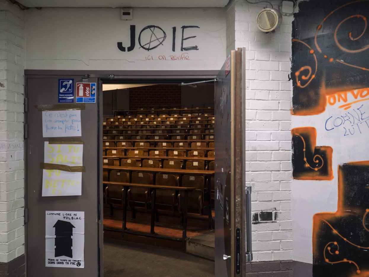 L'université Paris 1 Sorbonne Centre Mendes France, dans le XIIIe arrondissement de Paris - Surnommé la "Commune de Tolbiac" le site est occupé depuis le 26 mars par des étudiants et des militants, suite à une mobilisation contre les réformes du ministère de l'Education et du gouvernement Macron. Paris, France, le 13 avril 2018.